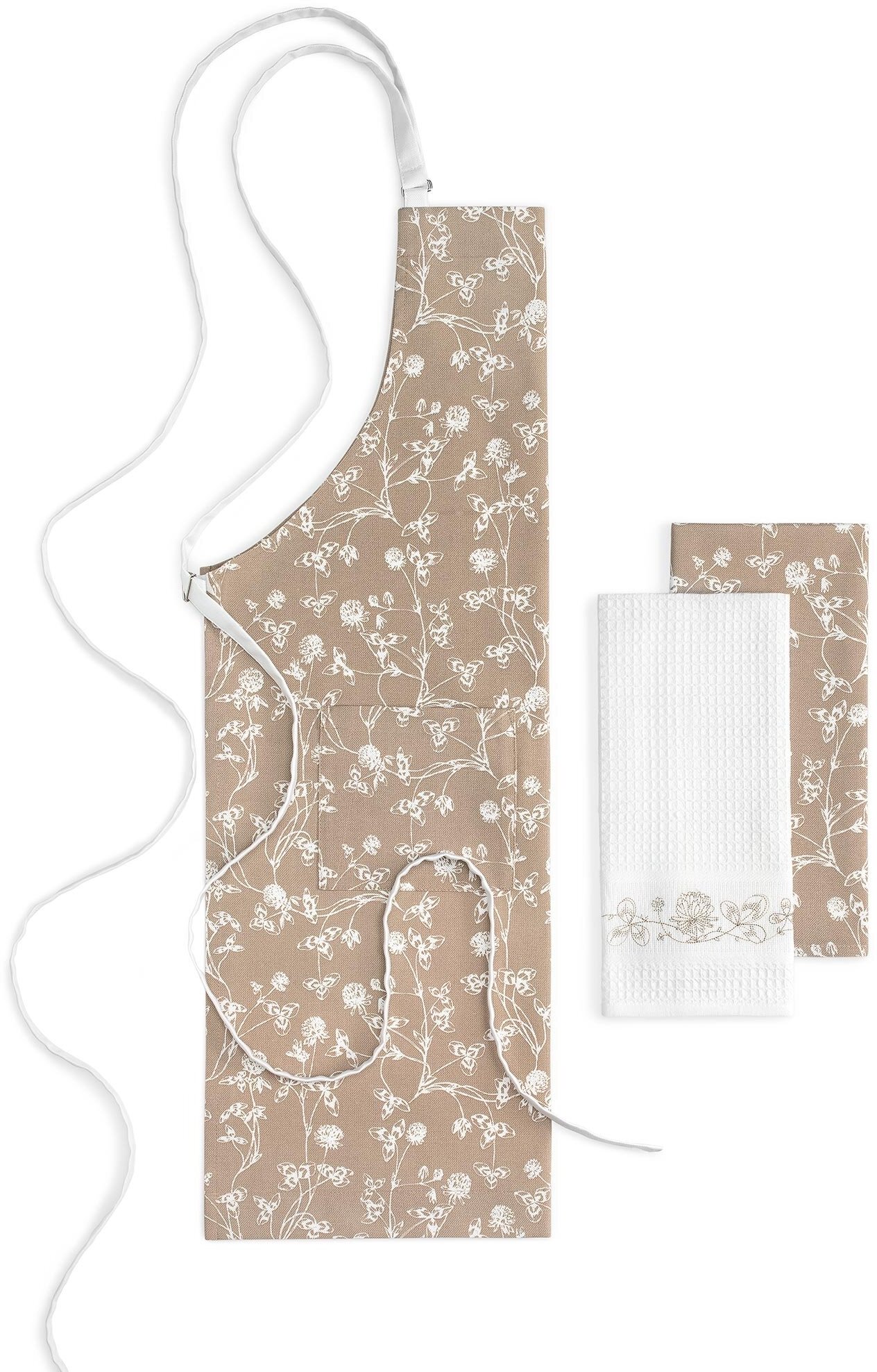 Кухонный фартук «Келли» изготовлен из высококачественного плотного хлопка со специальным водоотталкивающим покрытием. Материал изделия прост в уходе и имеет приятную фактуру, напоминающую льняное полотно. Белый растительный орнамент – цветы лугового клевера – выделяются на фоне ткани приятного оттенка охры. Неяркая гамма тонов и привлекательный растительный узор будут прекрасно смотреться на любой кухне. Фартук очень практичен – на нем предусмотрена специальная петля из такой же ткани, на которую можно повесить кухонную прихватку или полотенце для рук. Регулируемые завязки этой модели также очень удобны в использовании, вы можете подогнать фартук по фигуре, отрегулировать его длину и высоту верхней части изделия.