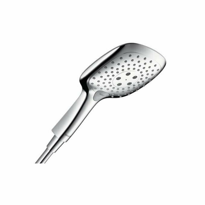 Ручной душ Raindance Select E 150 с блестящими хромированными поверхностями и мягким изгибом прямоугольного силуэта XXL доставляет радость в чистом виде и предлагает на выбор три типа струи нажатием кнопки: он дарит расслабляющее, бодрящее или освежающее удовольствие под душем.