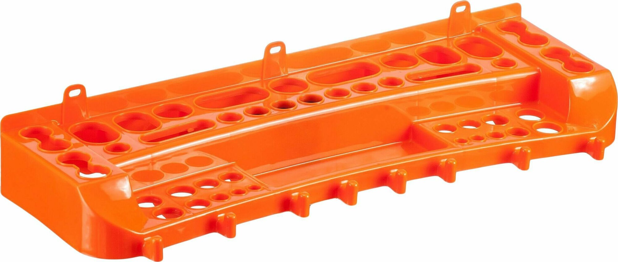 - Имеет большое количество отверстий разного размера, двойных отверстий, небольшую полку для хранения мелких предметов, крючки для подвеса