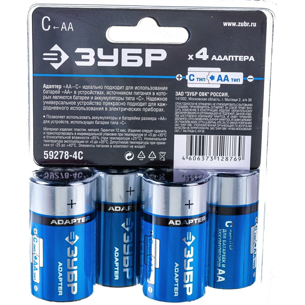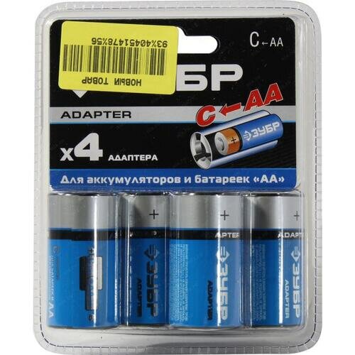 Адаптер с АА на C (4 шт) для Ni-Mh аккумуляторов Зубр представляет собой переходник, позволяющий использовать стандартные батарейки типа АА и никель-металлогидридные аккумуляторы вместо элементов питания типа С. Адаптер изготовлен из высококачественного пластика и подходит для ежедневного использования. Гарантирует надежность в эксплуатации и позволяет снизить расходы на питание различных устройств.
