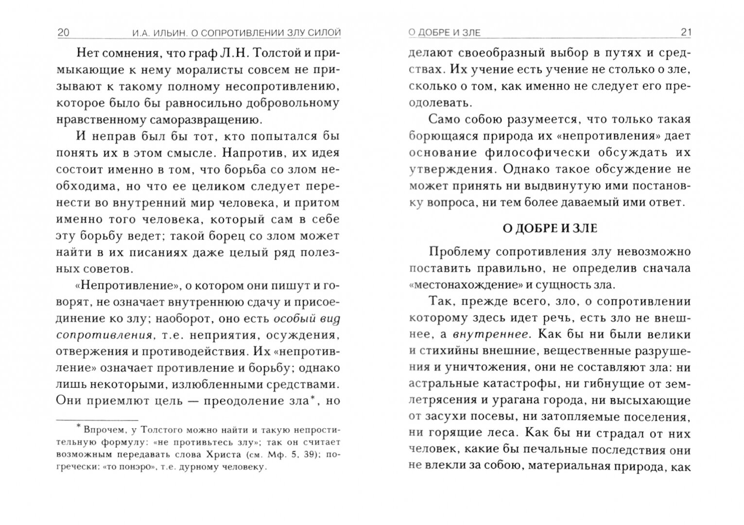 В этом философском труде Иван Александрович Ильин развернуто рассуждает "О сопротивлении злу силой" и дает исчерпывающие размышления на два противоречивых суждения: "Если ударили по одной щеке, подставь другую" и "Око за око, зуб за зуб".Подробно разбирая различные аспекты добра и зла, он проникает в суть вопроса со стороны религии, любви, души и справедливости, переходя к очень непростому вопросу о нравственной противоречивости войны, когда все человеческие чувства проявляются наиболее полно и ярко. Книга для людей, интересующихся русской философской и религиозной мыслью, словесностью и тем, для кого действительно важно вдумчивое и глубокое разрешение вопроса о сопротивлении злу силой.