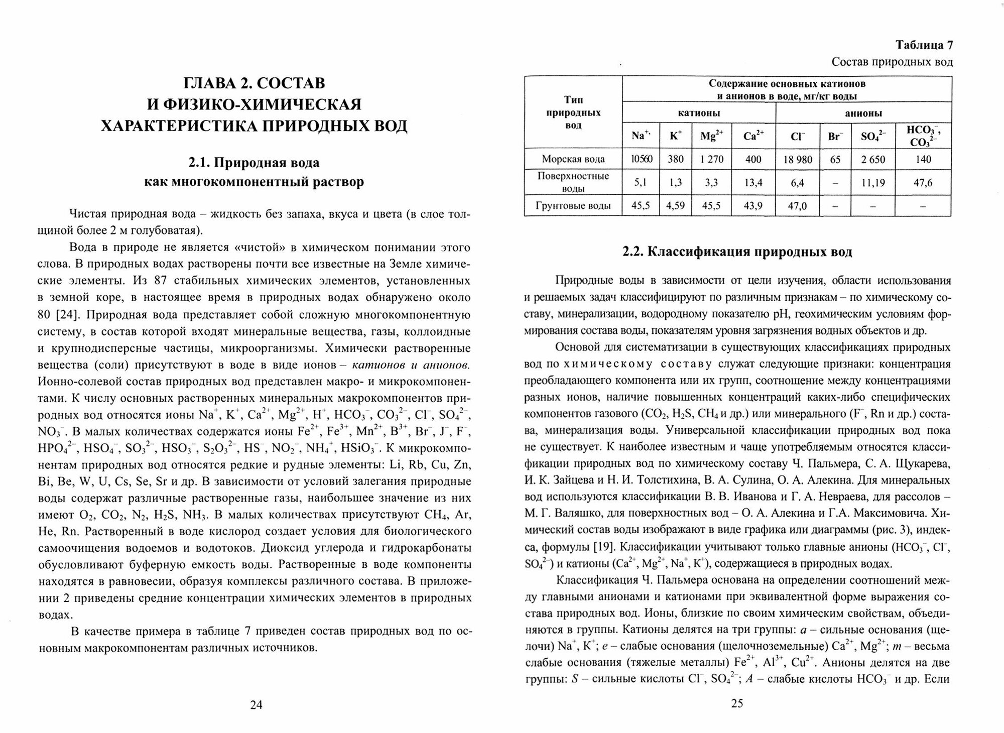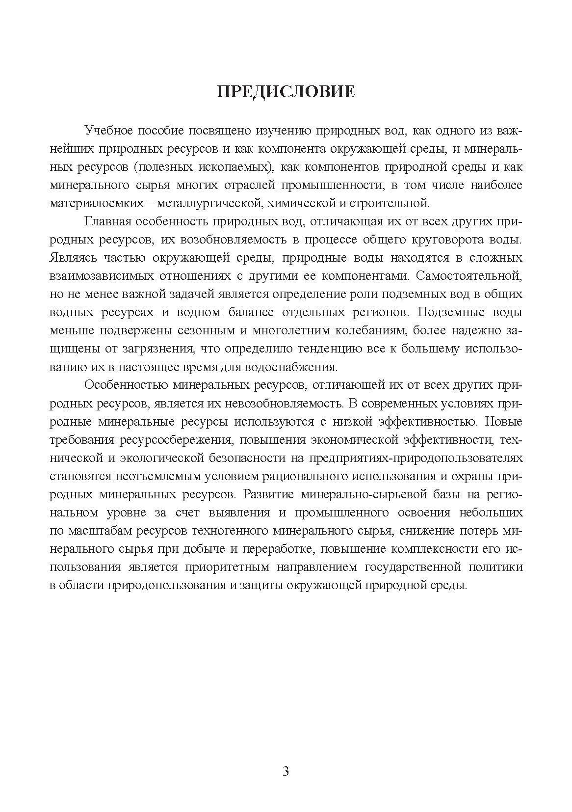 Рассмотрены теоретические основы и прикладные аспекты использования водных и минеральных природных ресурсов. Даны сведения о физико-химических свойствах воды, рассмотрены факторы и процессы формирования химического состава природных вод, их классификация и методы оценки качества, а также возможные последствия их загрязнения.