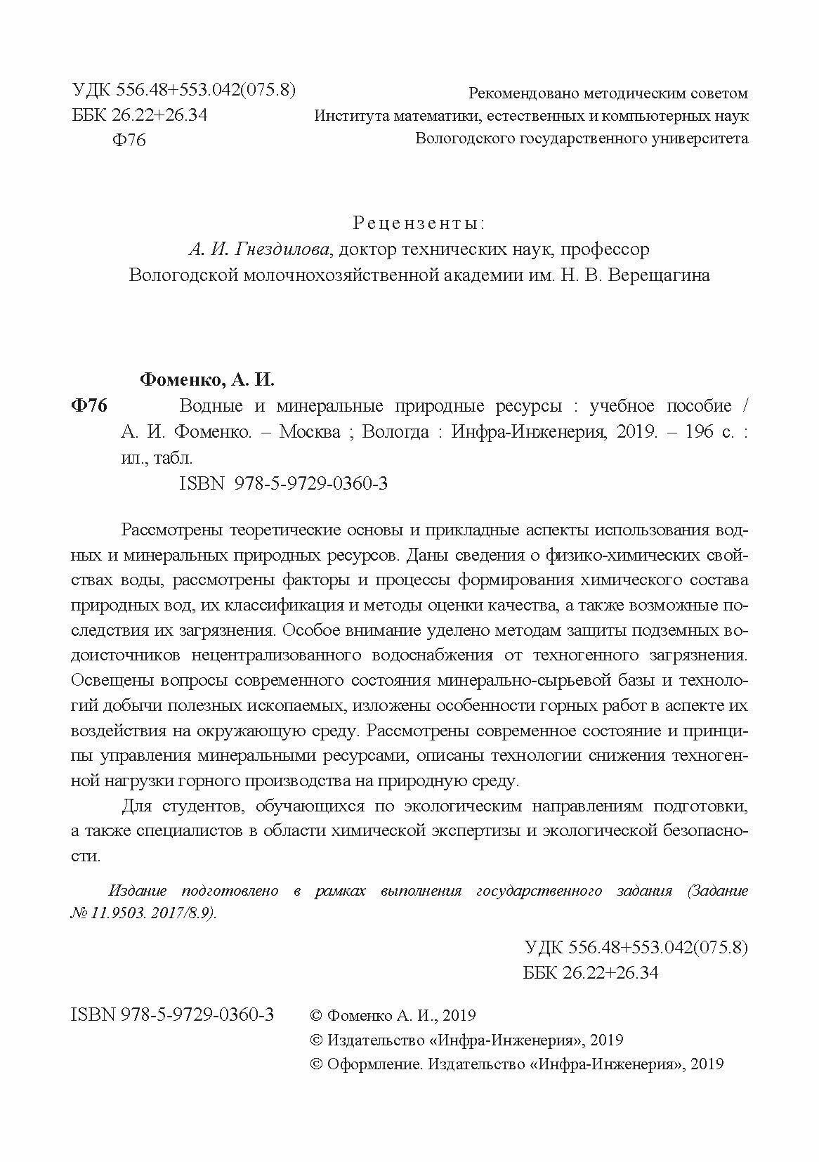 Водные и минеральные природные ресурсы. Учебное пособие (Фоменко Александра Ивановна); Инфра-Инженерия, 2019