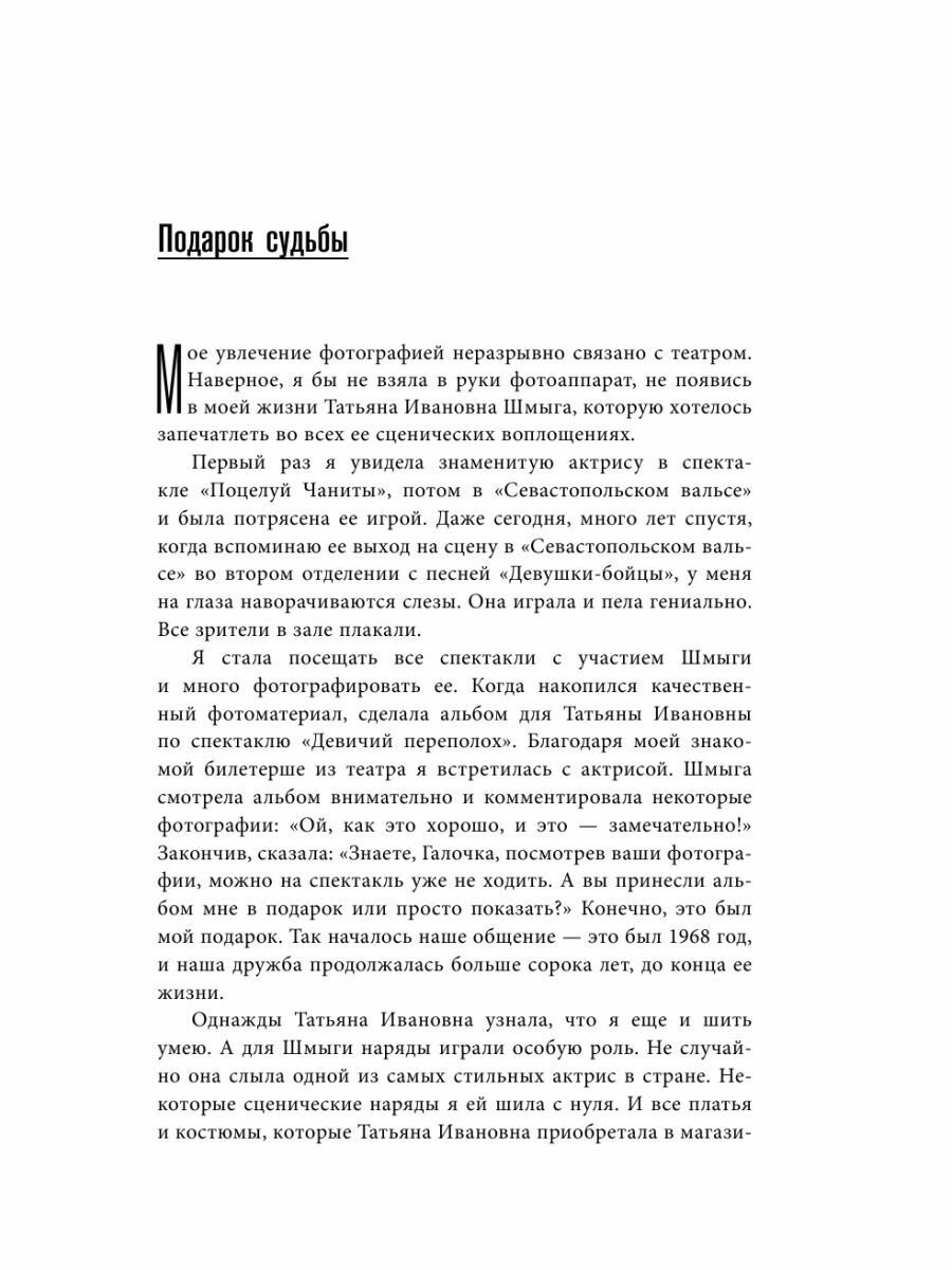 От этой книги оторваться невозможно. Читаешь и возвращаешься к ранее прочитанному, сопоставляешь с тем, что известно тебе из других источников., и начинаешь понимать: весь земной путь великой актрисы – это бесконечное, безостановочное движение её к высотам искусства. Как Шмыга в каждую роль вносила свежее, живое содержание,как раздвигала рамки устоявшихся опереточных штампов, как побеждала свои собственные слабости и недостатки, – это чтение увлекательное и поучительное. Удивительно скромная, она с большой нежностью и тактом пишет об актерах старой школы и молодых,о педагогах, о тех, кто был рядом с ней. Согласитесь, сегодня все, кому не лень, пишут мемуары. И нередко,. акцентируя на себе внимание, не стесняются выдавать о других нелицеприятную «правду». Книга Т.И. Шмыги исполнена великой благодарной любви не только к оперетте, к сцене,– к людям, к жизни. Светлая память выдающейся актрисе, глубокой, интереснейшей личности!