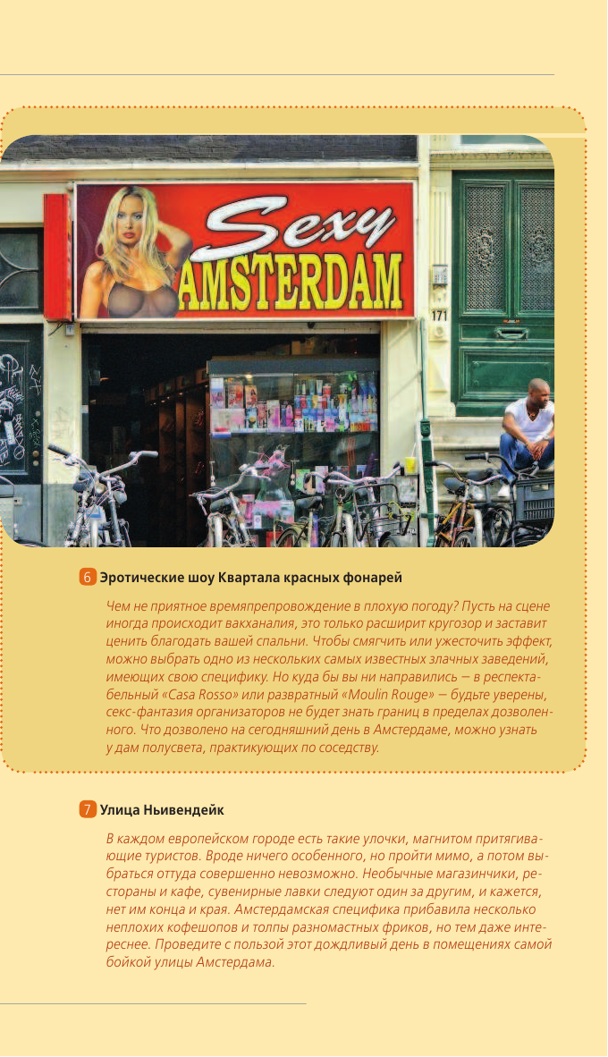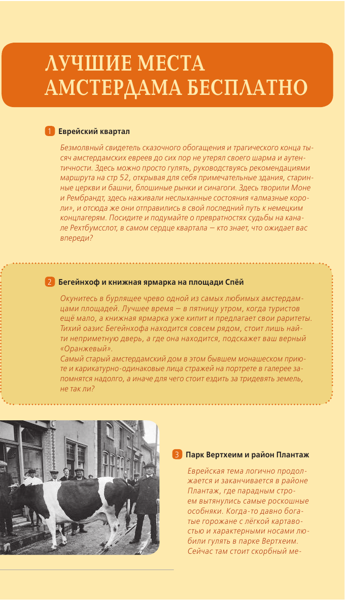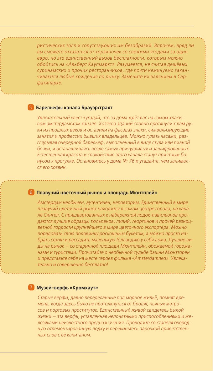 Яркий оранжевый путеводитель по самому свободному городу в мире может стать вашим! Интересные и многими уже любимые маршруты откроют перед вами двери невероятного Амстердама. Наши тропы проложены русскими авторами с учетом интересов и предпочтений россиян. В прогулке по музейному кварталу вы познакомитесь с работами сумасбродного Ван Гога и гениального Рембрандта. Для "просто погулять" вам будут предложены романтичные прогулки по чудесным набережным с прянично-игрушечными домами. В издании книги даны уникальные советы: что можно сделать абсолютно бесплатно, чем заняться в городе в дождь и другие. Ну и конечно, с оранжевым путеводителем вам откроются и самые скандальные, притягивающие и пикантные стороны голландской столицы - если захотите, то весело покурите в знаменитых кофе-шопах, приглядитесь к красавицам в Квартале красных фонарей и даже примите участие в гей-параде. Как далеко способно завести вас ваше любопытство? Оранжевый гид везде пойдет с вами!