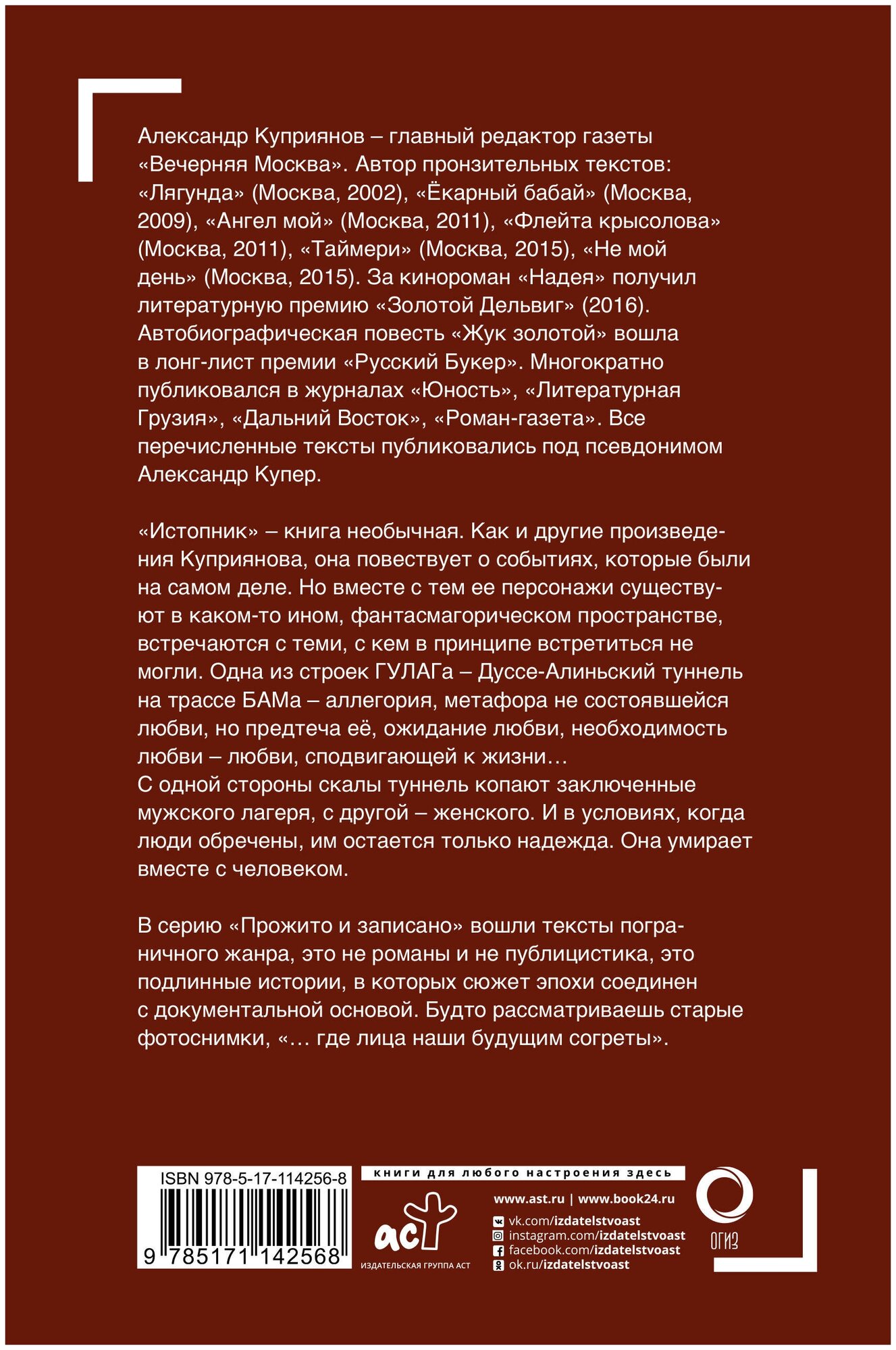«Истопник» – книга необычная. Как и другие произведения Куприянова, она повествует о событиях, которые были на самом деле. Но вместе с тем ее персонажи существуют в каком-то ином, фантасмагорическом пространстве, встречаются с теми, с кем в принципе встретиться не могли. Одна из строек ГУЛАГа – Дуссе-Алиньский туннель на трассе БАМа – аллегория, метафора не состоявшейся любви, но предтеча её, ожидание любви, необходимость любви – любви, сподвигающей к жизни…