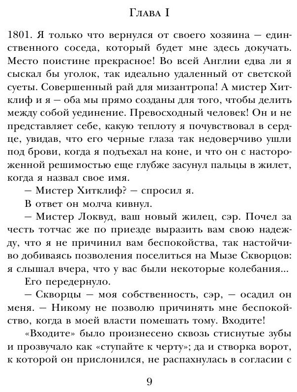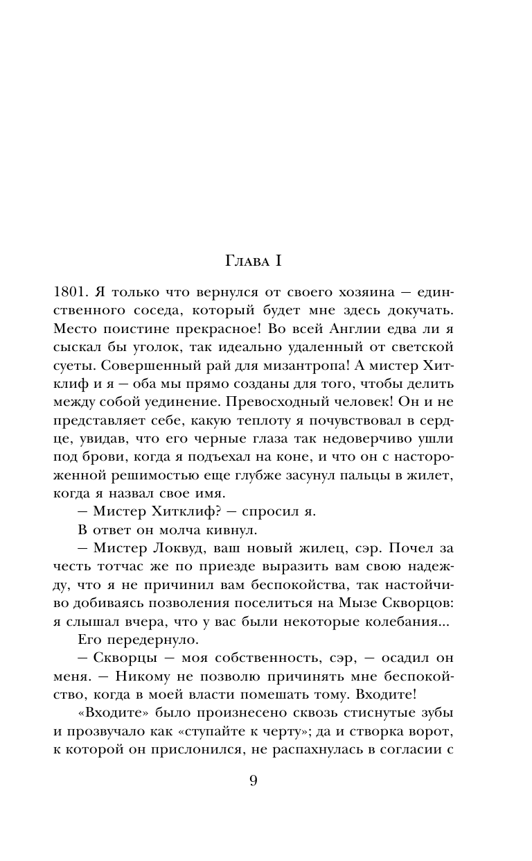 Классическая английская литература, и этим уже почти все сказано. Ровное двуплановое повествование: с одной стороны, от лица "пятого персонажа", случайно ставшего свидетелем жизненной драмы, с другой - от лица поделившейся с ним подробностями домоправительницы, на глазах которой и разворачивалось действие. Сюжет развивается вокруг центральной пары - Хитклифа и Кэтрин Эрншо, - чье взаимное и сильное чувство повлияло не только на их жизни, но и на жизни всех, кто их окружал. Не обошлось, конечно, без свойственной тому времени готичности и некоторой экзальтированности героини (герой, впрочем, не сильно отставал). В целом роман можно смело рекомендовать любителям Джен Эйр, Женщины в белом т.д. Отдельно хочется отметить именно это издание соотношением цены и качества: для бюджетного, в общем-то, варианта, получилось совсем неплохо, удобная глазу организация текста на странице. Вердикт: в подарок, конечно, не стоит, но в качестве эконом-варианта для себя - вполне.
