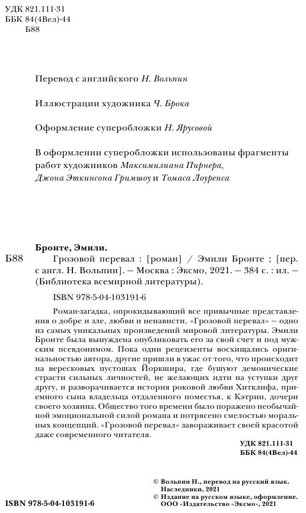 История трагической любви двух диких сердец - одно из самых популярных и узнаваемых произведений в европейской литературе XIX века. "Грозовой перевал" был неоднократно экранизирован, а отсылки к сюжету можно найти во многих произведениях о разрушительной страсти. Любовь на фоне мрачных вересковых пустошей привела к помешательству и смерти героев единственного романа Эмили Бронте. Ярость, бунт и привязанность слились в единое целое в жизни Хитклиффа и Кэтрин. Чувства диковатого приемыша к сводной сестре не смиряются ни перед логикой, ни перед моралью, над ними не властны ни человеческая сила, ни злой рок, ни даже смерть. Эмоции, полностью поглотившие своего хозяина и сломавшие не одну жизнь, напугали человека викторианской эпохи, но следующие поколения читателей просто заворожили. Этот роман можно любить и можно ненавидеть. Одно однозначно - остаться к нему равнодушным крайне сложно.