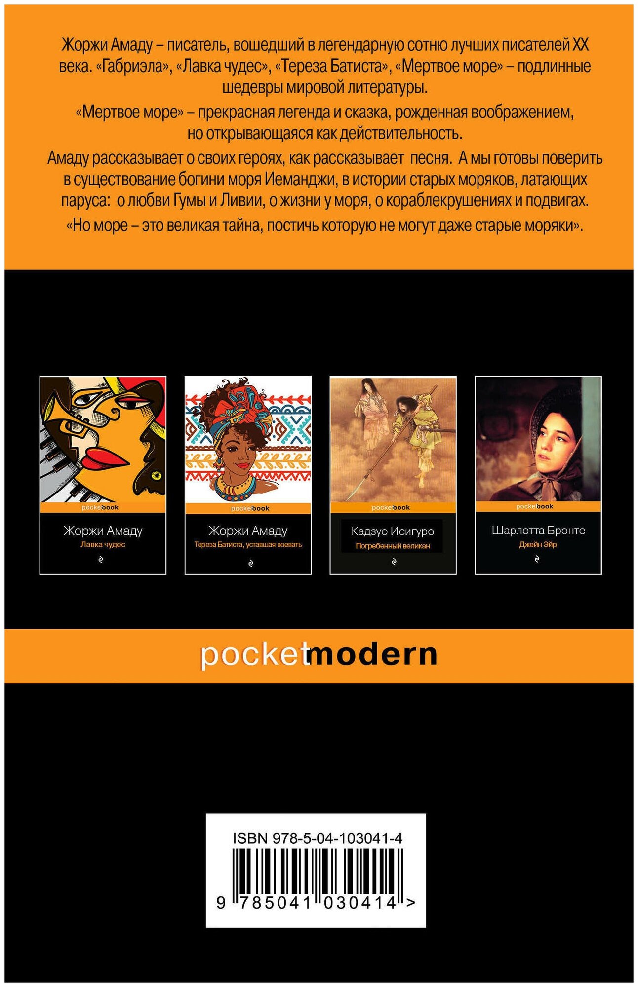 Жоржи Амаду - выдающийся писатель Бразилии. Для русского человека Жоржи Амаду - это сама Бразилия. Ее природа, экономика, культура, кулинария, верования и праздники, но самое главное - ее люди, земляки писателя, его герои, его друзья. В нем соединились гений писателя и пламенное сердце борца, протестующего против любой социальной несправедливости. Жоржи Амаду никогда не был "диванным революционером", он на собственном опыте знал, что такое подполье, тюрьма, эмиграция и отражал этот опыт в своих произведениях. В "Мертвом море" он выступает подлинным новатором, смело соединяет миф и реальность, эпос и лирику. Именно он открыл жанр магического реализма. Когда Амаду писал "Мертвое море", Габриэлю Маркесу было 9 лет. "Мертвое море" - песня моряка, сказка, легенда, рожденная воображением, открывающаяся как реальность. Вы поверите в существование богини моря Иеманджи и далекой земли моряков Айока. Вы услышите истории старых моряков о кораблекрушениях и подвигах, для Вас зазвучат печальные песни о судьбе моряков и их любимых. "Людям моря есть что порассказать. Послушайте историю Гумы и Ливии. Это история жизни у моря, это история любви у моря".