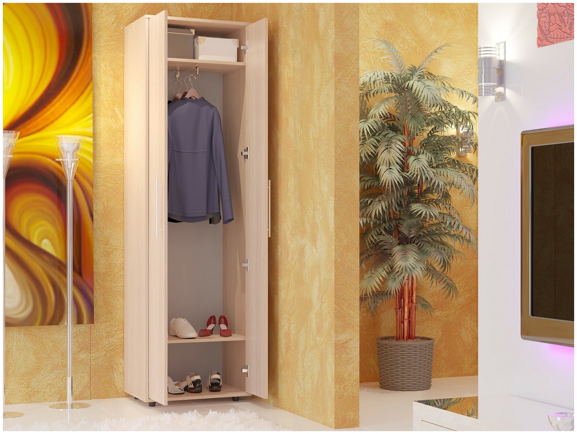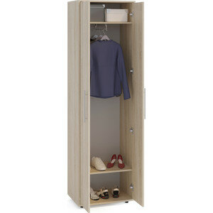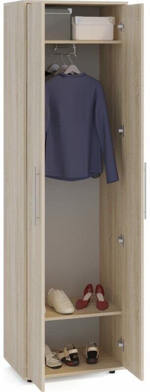 Шкаф для одежды с выдвижной штангой СШО-1 - функциональный и компактный - порадует вместительной системой хранения.Шкаф оборудован двустворчатыми дверями. Внутри шкафа расположены две полки и выдвижная вешалка.Изделие оснащено пластиковыми ножками, предотвращающими «размокание» ДСП вследствие влажной уборки напольного покрытия.В прихожей, детской и молодёжной комнате, в стильной гостиной или кабинете шкаф найдёт своё достойное место.Шкаф поможет сохранить ваши вещи в чистоте и порядке.В производстве использовались только высококачественные материалы и фурнитуры.Шкаф для одежды с выдвижной штангой изготовлены из качественного ламинированного ДСП толщиной 16 мм, самого популярного материала для производства корпусной мебели, обеспечивающего необходимую прочность и долговечность деталей.Мебель поставляется в разобранном виде, с комплектом фурнитуры и инструкцией по сборке.Габаритные размеры (ШхГхВ): 60х43х209 см.Производитель - Российская фабрика мебели Сокол.