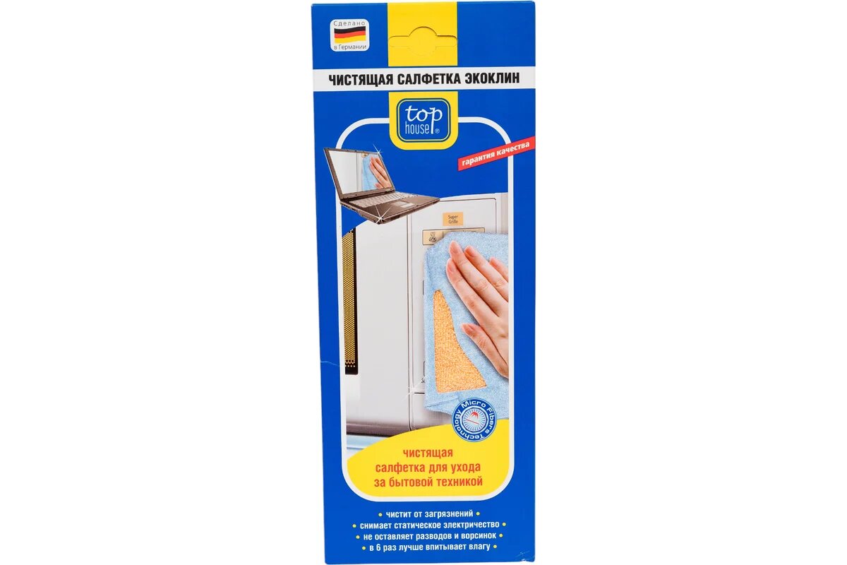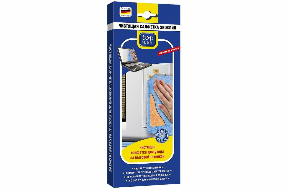 Салфетка для уборки Top House Экоклин предназначена для очистки корпусов бытовой техники, оргтехники, аудио- и видеотехники из пластика, стекла и металла от пыли, пятен, жировых загрязнений, а также для снятия статического электричества. Надолго снимает статическое электричество. Не оставляет разводов, ворсинок и царапин.