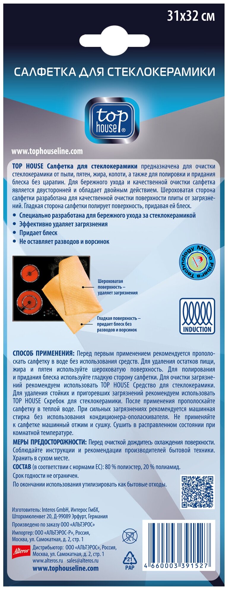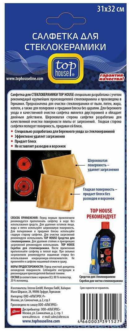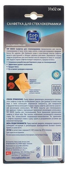 | Способ применения | шероховатая сторона салфетки разработана для качественной очистки поверхности плиты от загрязнений, гладкая сторона салфетки полирует поверхность, придавая ей блеск. |