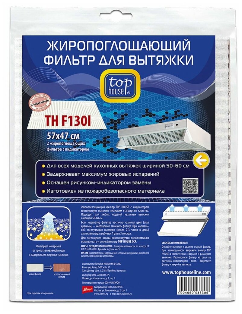 Универсальный фильтр для вытяжки Top House Жиропоглощающий TH F130I фильтрует испарения от приготавливаемой пищи и задерживает жировые частицы. Подходит к любым кухонным вытяжкам шириной 50-60 см. Изменение цвета специального индикатора сообщает о необходимости замены фильтра.