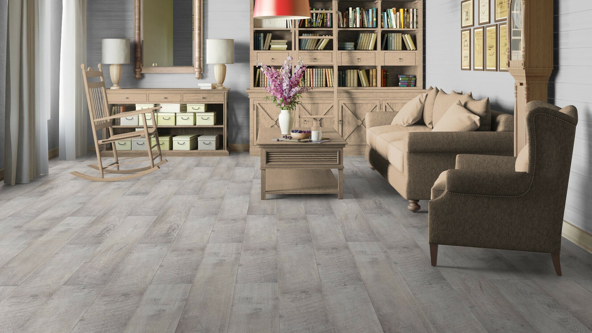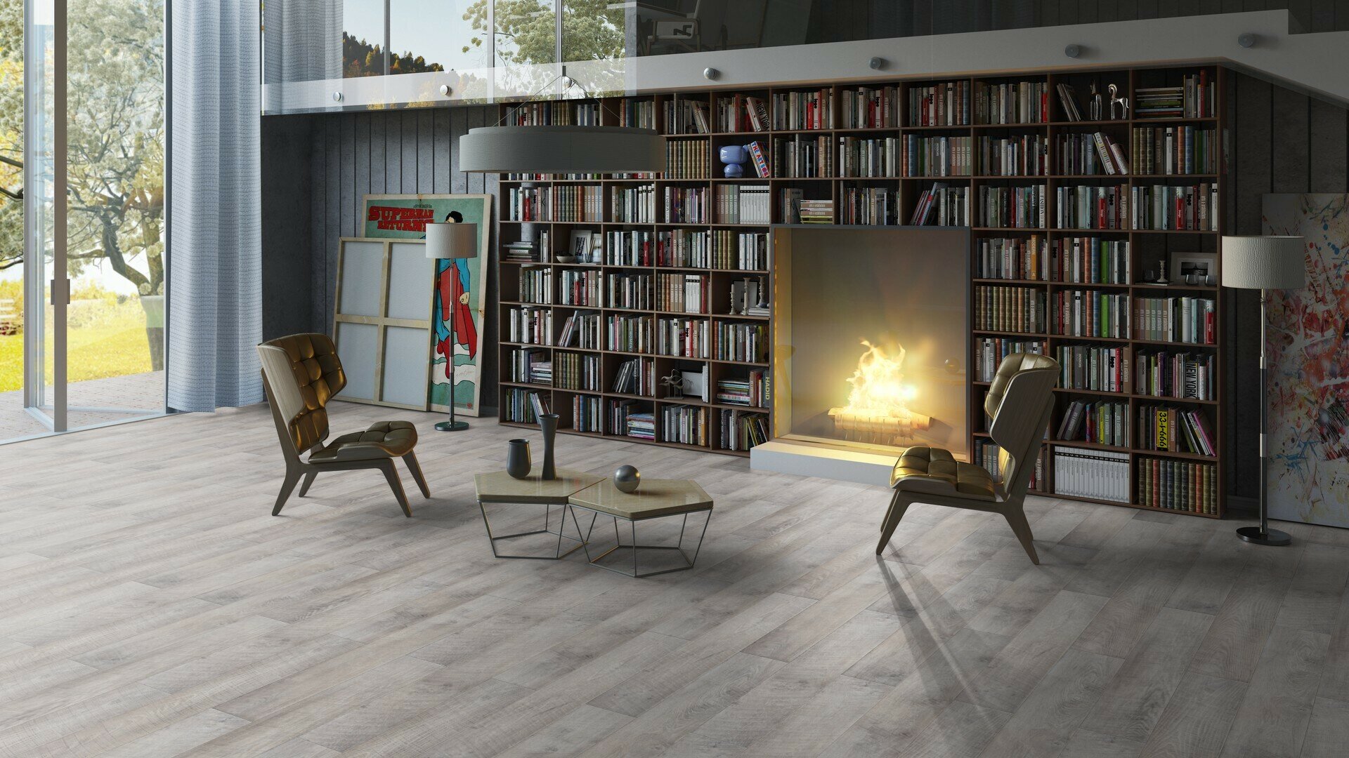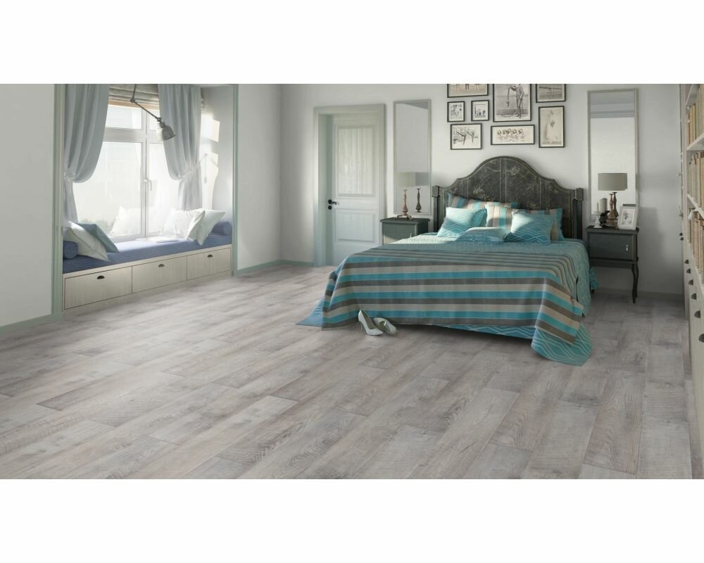 Благодаря глубокому тиснению в регистре ламинат реалистично имитирует природную рельефность древесины. Благородный серый цвет и четырехсторонняя фаска увеличивают сходство с выдержанной дубовой доской. Материал соответствует модным стилям винтаж, лофт, арт-деко, хай-тек.