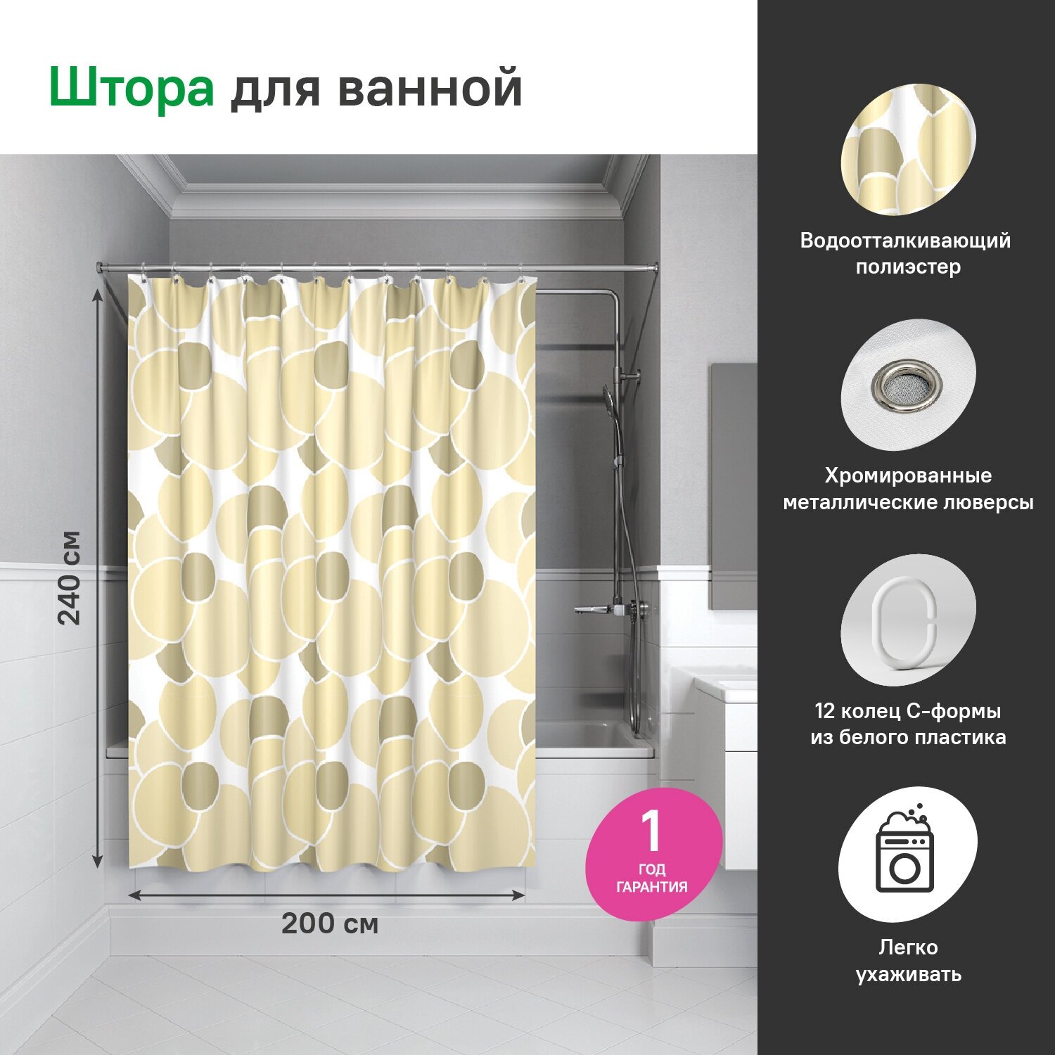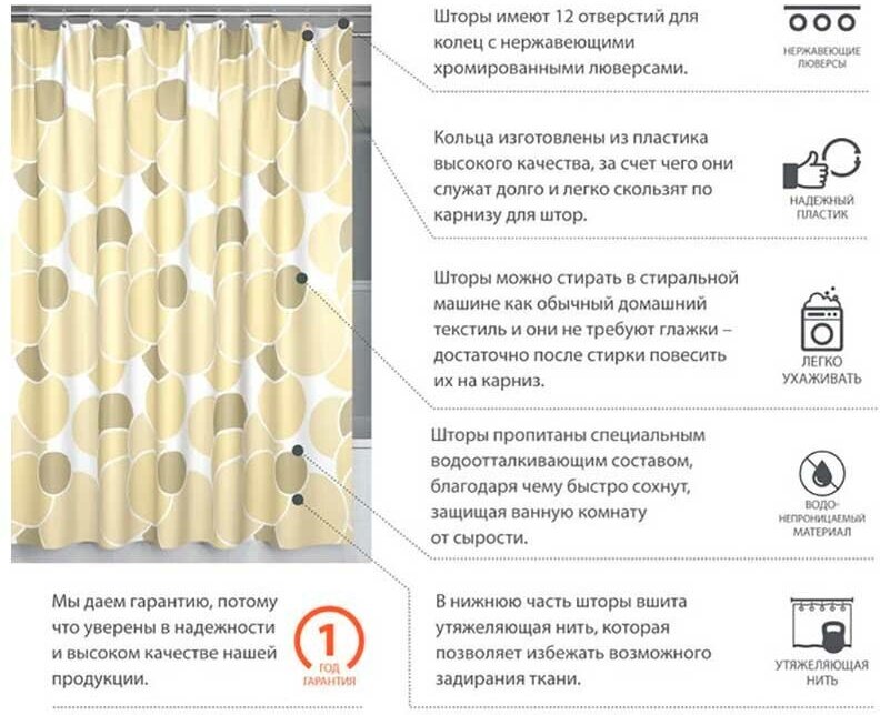 Штора для ванны изготовлена из качественного материала - полиэстера, обладающего водоотталкивающим свойством. Изделие способно отгородит зону купания от остального помещения. Это особенно важно для домов с совмещенным санузлом. Полотно шторки задержит влагу.