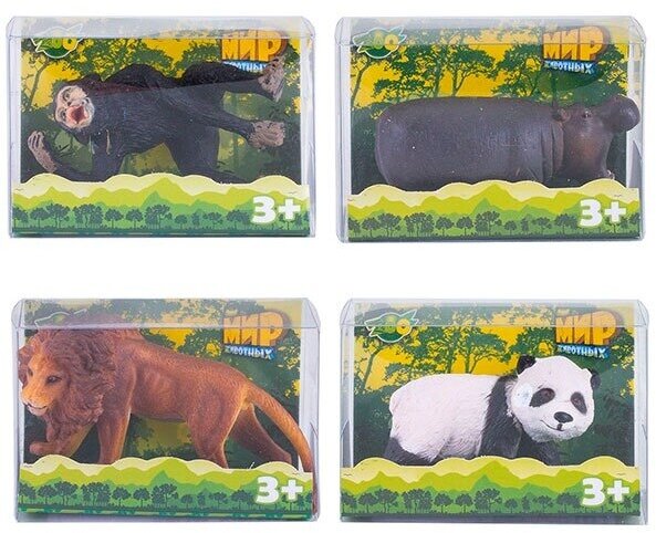 В ассортименте 12 фигурок, в том числе бегемот, слон, обезьяна, белка, медведь, панда, тигр, лев.