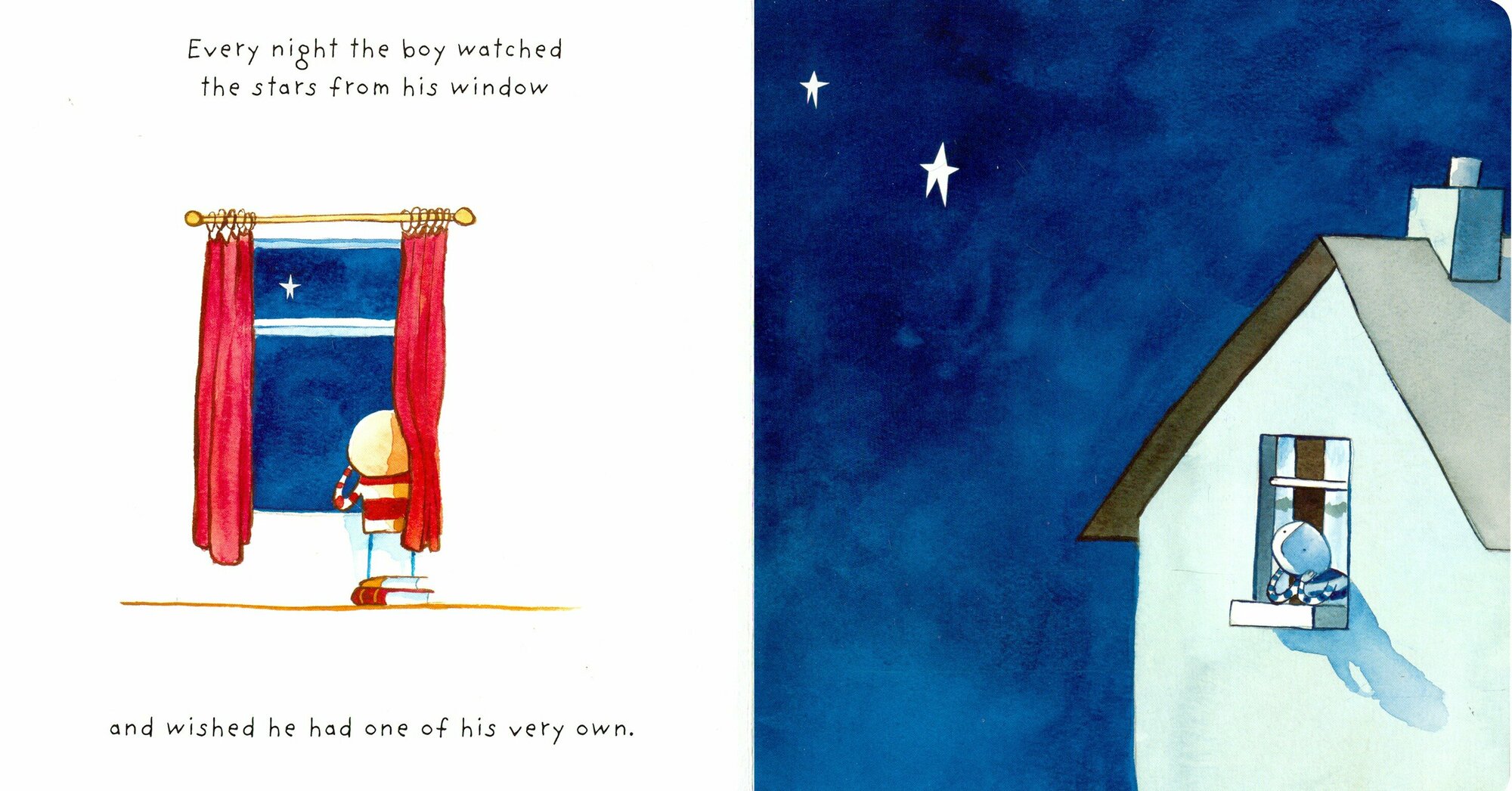 Once there was a boy who loved stars so much that he wished he had one of his very own. Every night he watched the stars in the sky from his bedroom window and dreamed of how he could be their friend and how they could play hide-and-go-seek together.