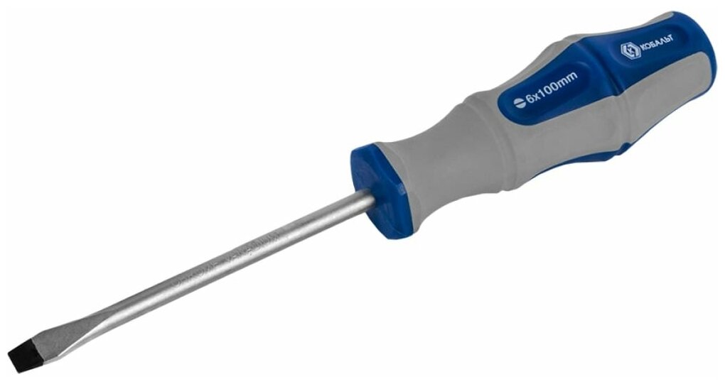 Отвертка Ultra Grip SL 6 х 100 мм CR-V КОБАЛЬТ имеет плоский профиль. Применяется в монтажных или ремонтных работах. Для комфортного использования инструмент оснащен магнитным наконечником, который расположен на стальном стержне. Во время работы изделие выдерживает различные нагрузки, за счет материала и закалки до твердости 51-52 HRC. Рукоятка с изгибами обеспечивает крепкий захват и защищает от соскальзывания руки.