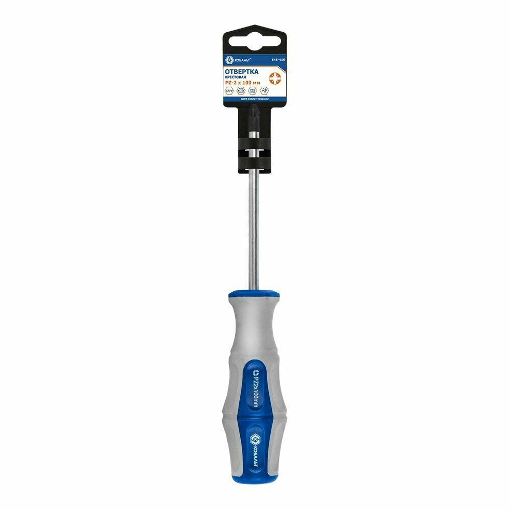 Отвёртка Ultra Grip PZ-2 х 100 мм CR-V КОБАЛЬТ - ручной инструмент, предназначенный для работ с крестовыми крепежами. Для точного контроля детали во время работы предусмотрен магнитный наконечник. Закаленный стержень из качественной стали обеспечивает стойкость при нагрузках и долгую службу изделия. Специально спроектированная рукоятка дает возможность для крепкого захвата без выскальзывания.