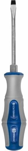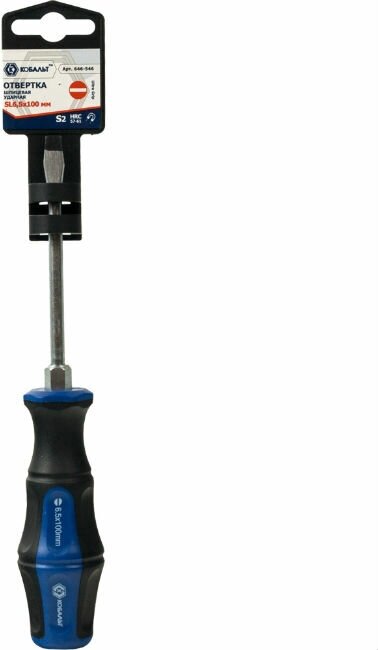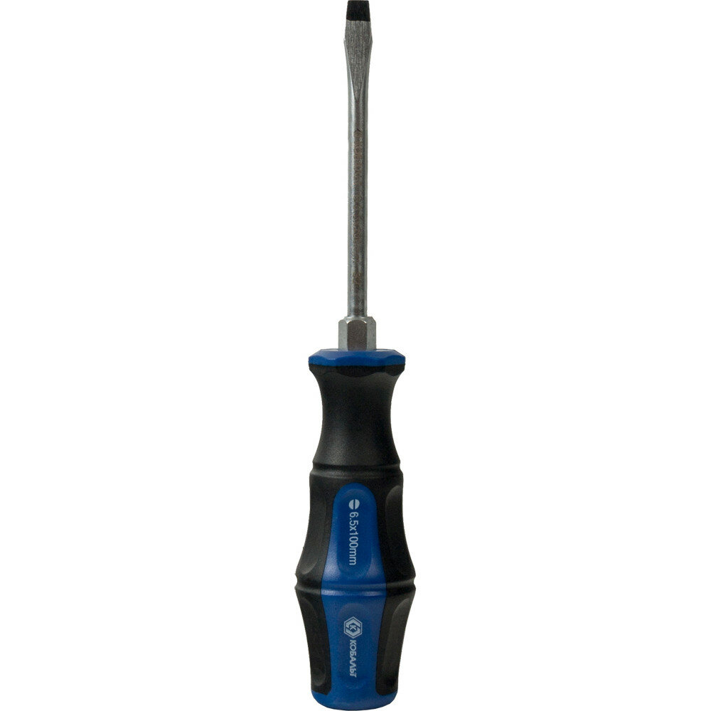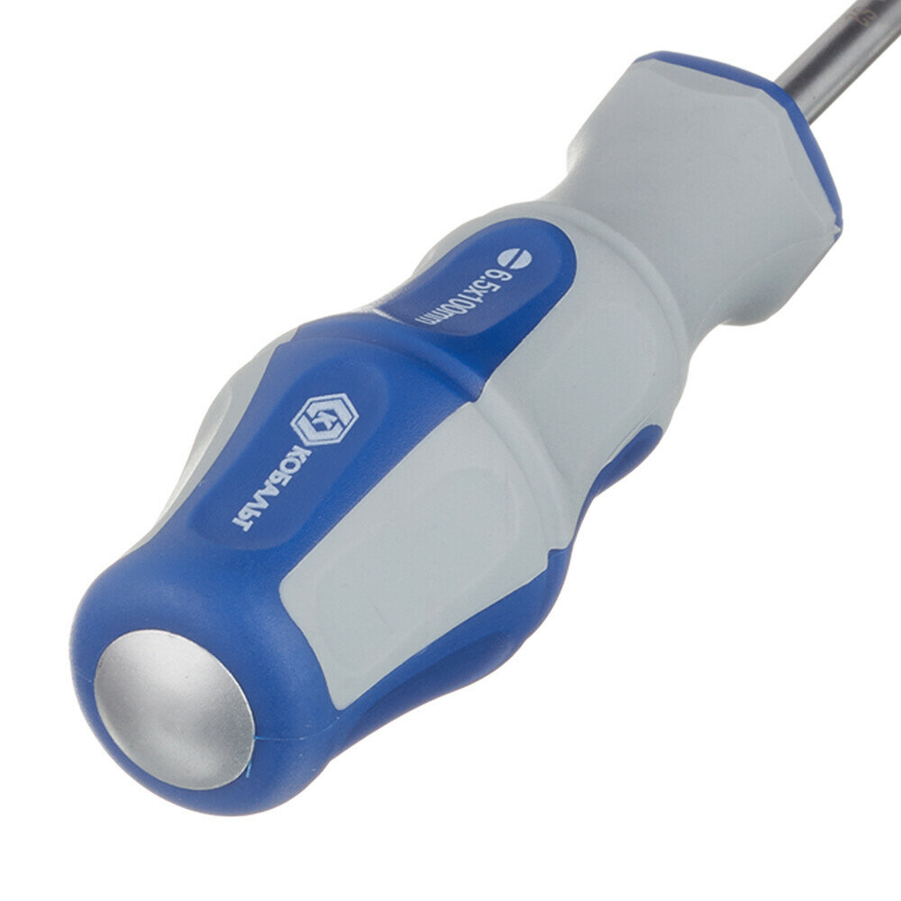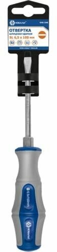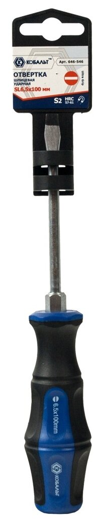 Отвертка ударная Кобальт Ultra Grip SL 6.5x100 мм - инструмент для передачи крутящего моментарезьбовому крепежу с внутренним плоским профилем. Рабочая часть состоит из износостойкого стального стержня и магнитного наконечника. Для упрочнения стержень с твердостью 51 - 54 HRC был подвержен закалке. Двухкомпонентная рукоятка обеспечивает крепкий захватпри работе.