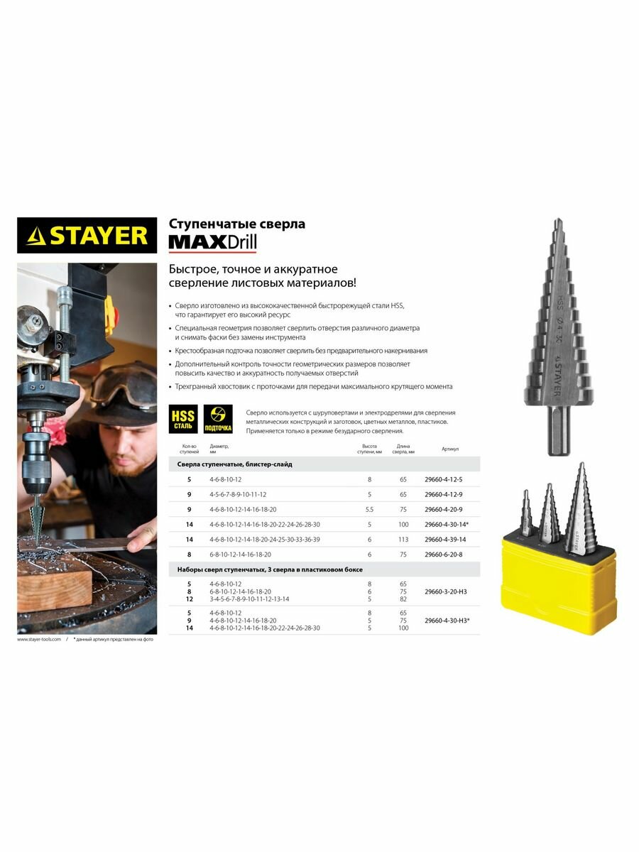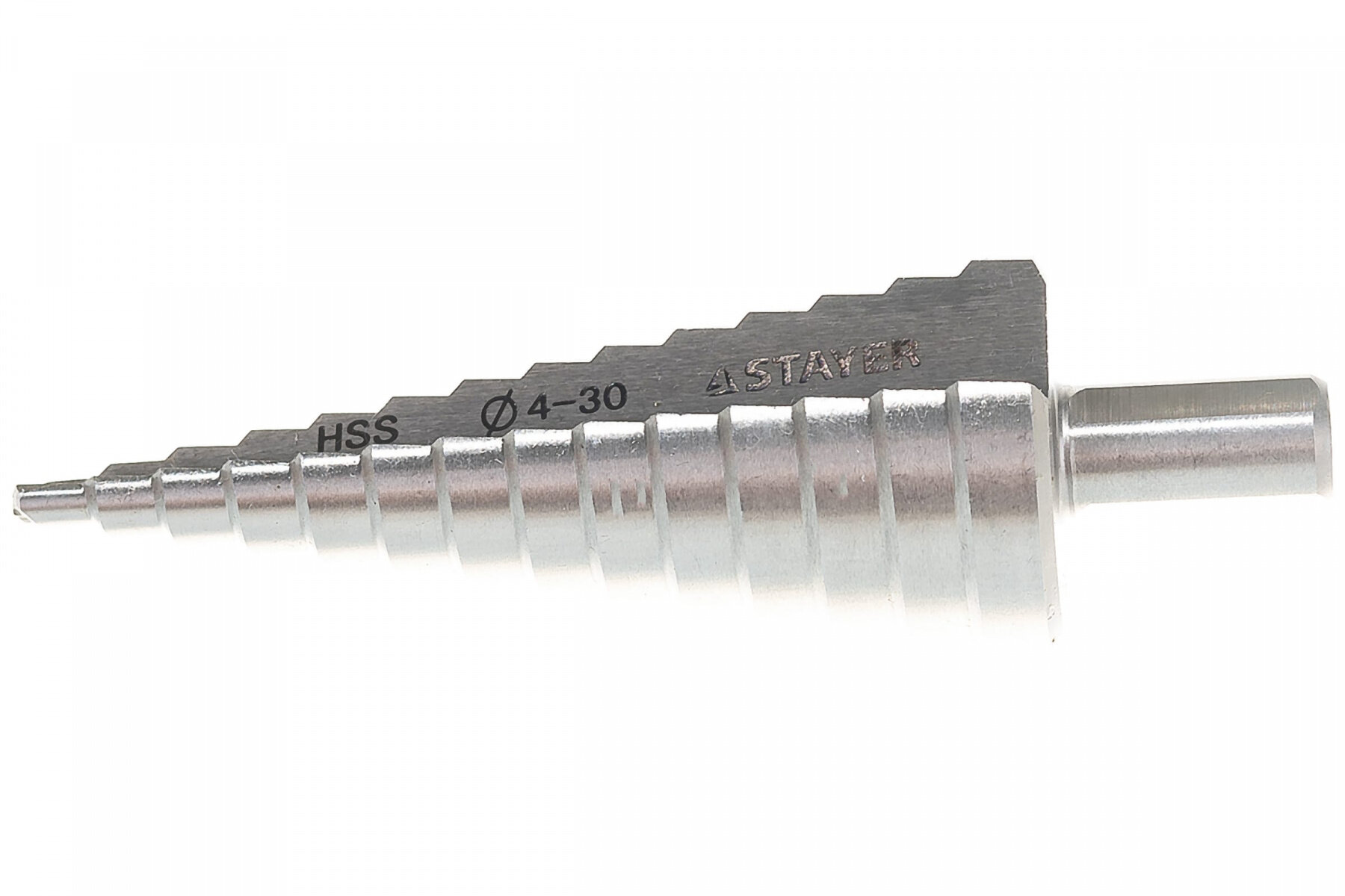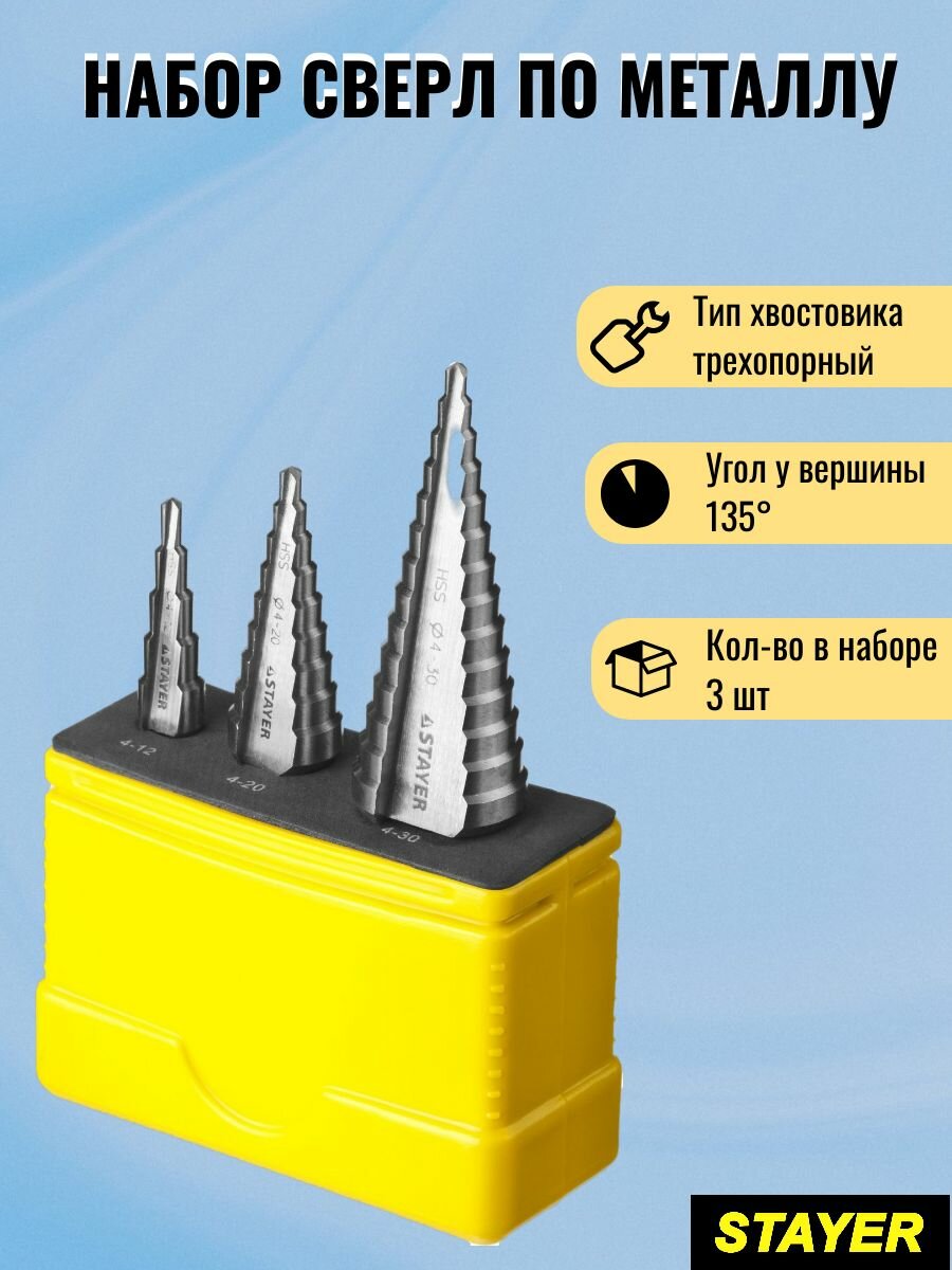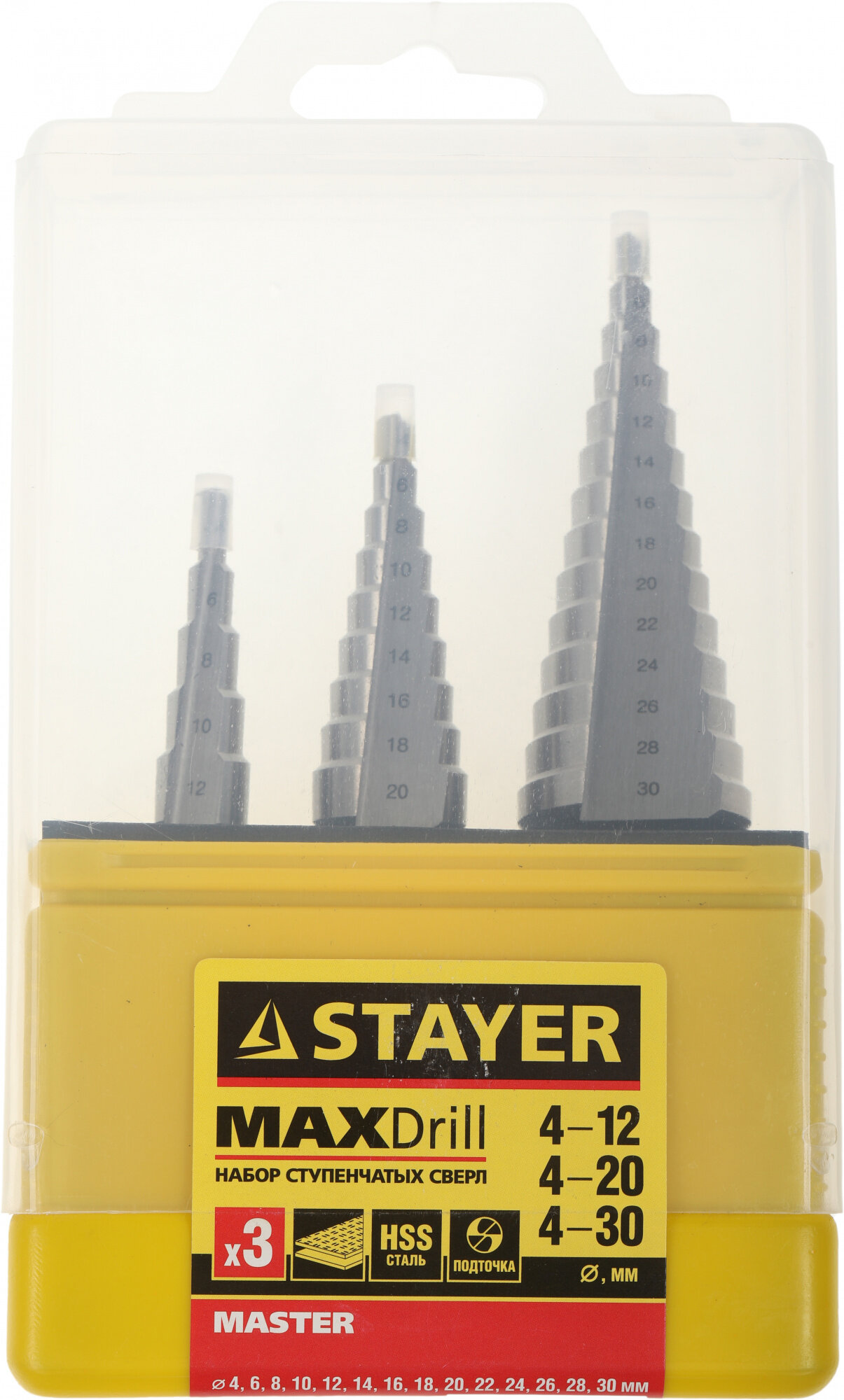 Набор сверл ступенчатых Stayer 3 шт, 4-30мм, HSS-R, быстрорежущая сталь М2(S6-5-2) Р6М5, класс А