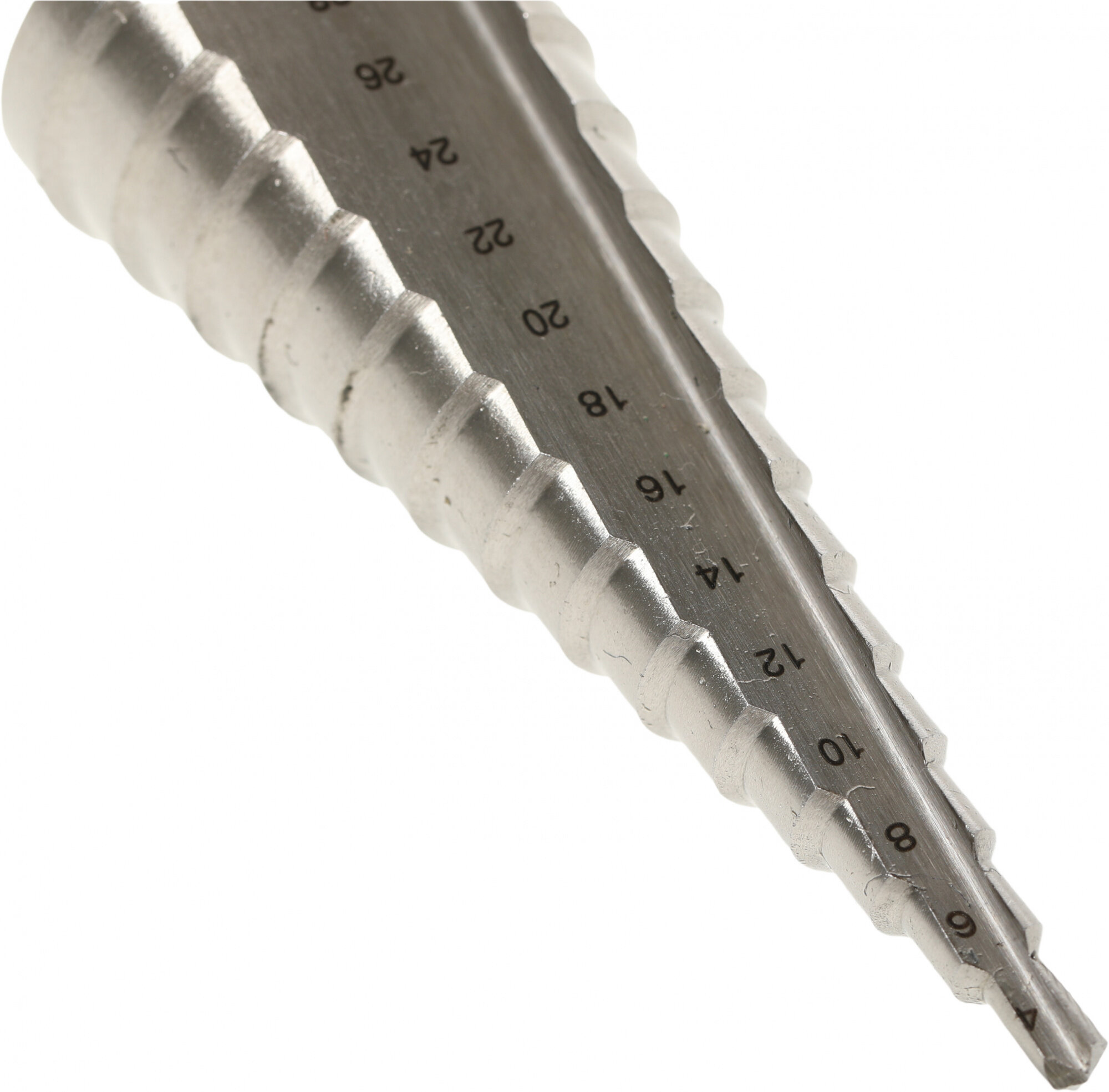 Ступенчатые сверла по сталям и цветным металлам, сталь HSS, d=4-12мм, 5 ступеней d 4-20 мм 9 ступеней, d 4-30мм 14 ступеней. Крестообразная подточка режущей кромки предотвращает возможность подклинивания.