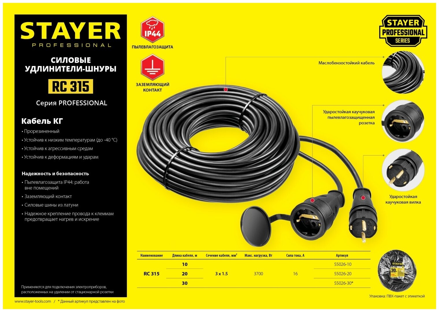 | Прочие особенности и свойства | Удлинители-шнуры STAYER – залог уверенной и безопасной работы без нагрева и искрения. Применяются для подключения электроприборов, расположенных на удалении от стационарной розетки., , Прорезиненный кабель КГ устойчив к низким температурам (до -40°С), агрессивным средам, деформациям и ударам, , Защита от влаги и пыли IP44 позволяет выполнять работы вне помещений, Ударостойкие каучуковые вилка и розетка, Заземляющий контакт, Силовые шины из латуни, Надежное крепление провода к клеммам предотвращает нагрев и искрение |