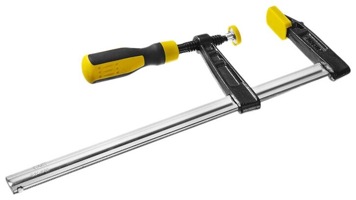 Струбцина STAYER служит для фиксации и крепкого удержания деталей при склейке или последующей обработке. Инструмент отличается высокой прочностью, надежностью и долговечностью в эксплуатации. Подходит для бытового и профессионального использования.Преимущества Ходовой винт с трапециевидной резьбой для передачи высокого крутящего момента Губки из высокопрочного чугуна Рейка из Hi-Q стали, закалена Особый профиль рейки обеспечивает высокую жесткость при зажатии Пластиковые накладки для предотвращения повреждения поверхностей зажимаемой детали Рукоятка струбцины STAYER выполнена из двухкомпонентного материала и имеет эргономичную форму