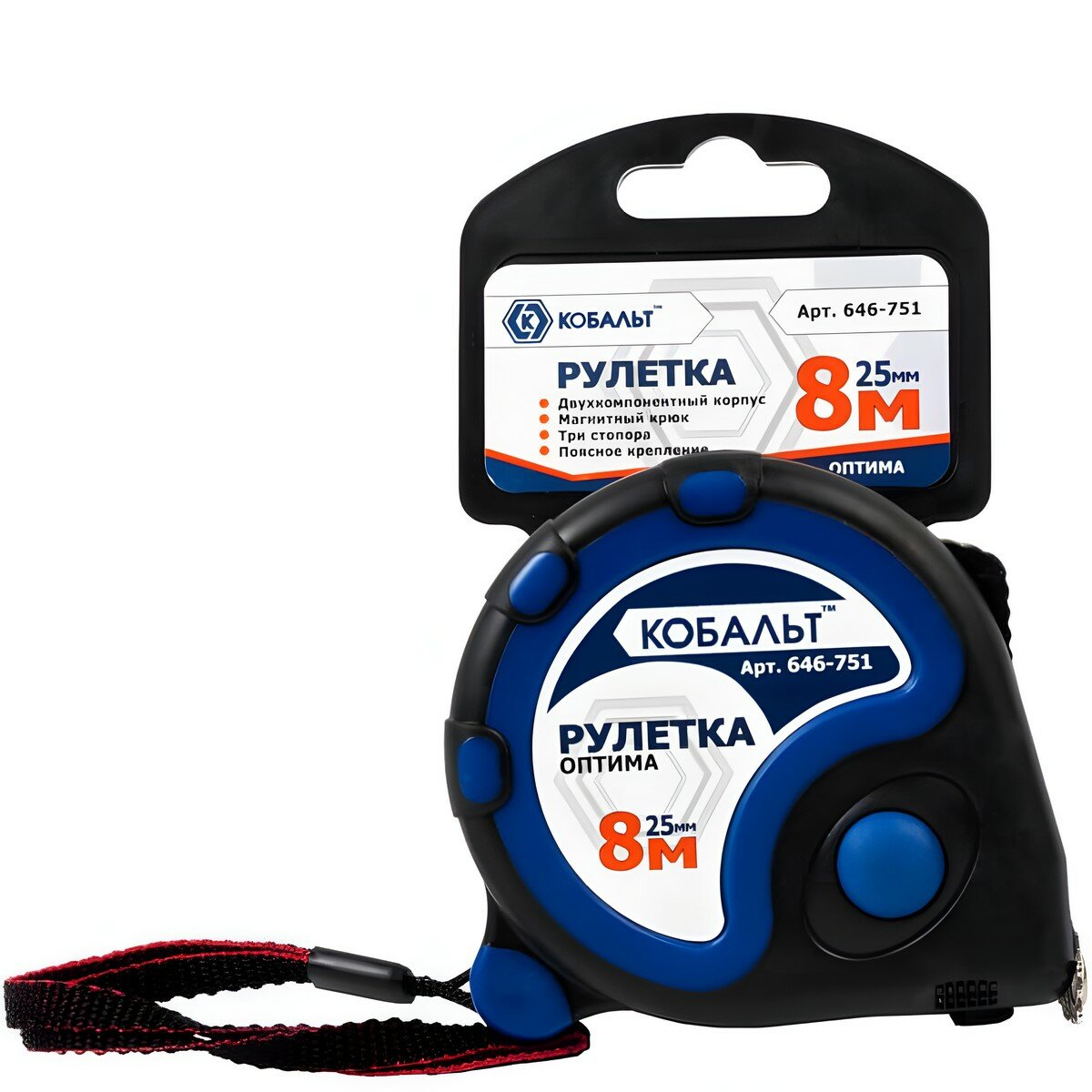Кобальт Рулетка «Кобальт» «Оптима» пригодится любому мастеру. Ее корпус изготовлен из высококачественного износостойкого пластика с противоскользящим покрытием, предотвращающим случайное выскальзывание из рук. Для удобства использования данная модель оснащена магнитным крюком, поясным креплением, а также тремя стопорами. Длина ленты составляет 8 м.