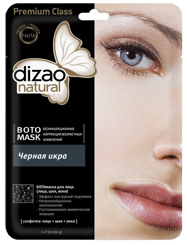 Ботомаска Dizao Чёрная икра для ухода за кожей лица с эффектом контурной подтяжки, интенсивным омоложением и разглаживанием мимических морщин. Экстракт черной икры в сочетании с гиалуроновой кислотой являются мощными стимуляторами молодости, стимулируют выработку коллагена и эластина. Кожа приобретает здоровый блеск, становится упругой и эластичной. Миорелаксирующий пептидный комплекс глубоко проникает в клетки кожи, насыщает питательными компонентами и разглаживает морщины.