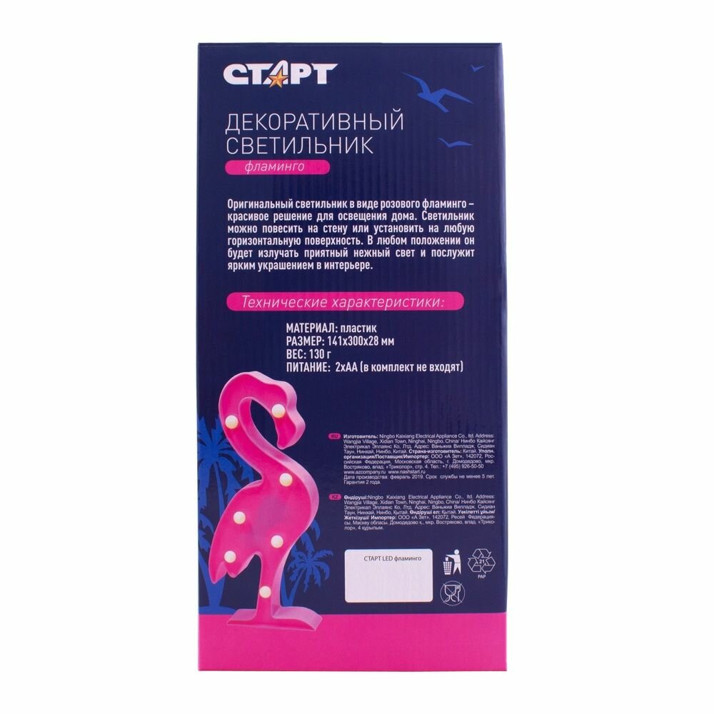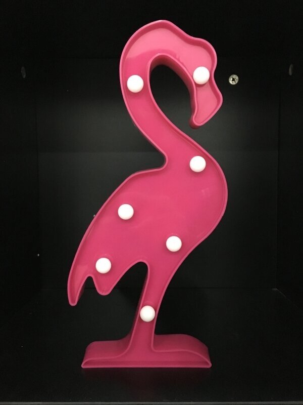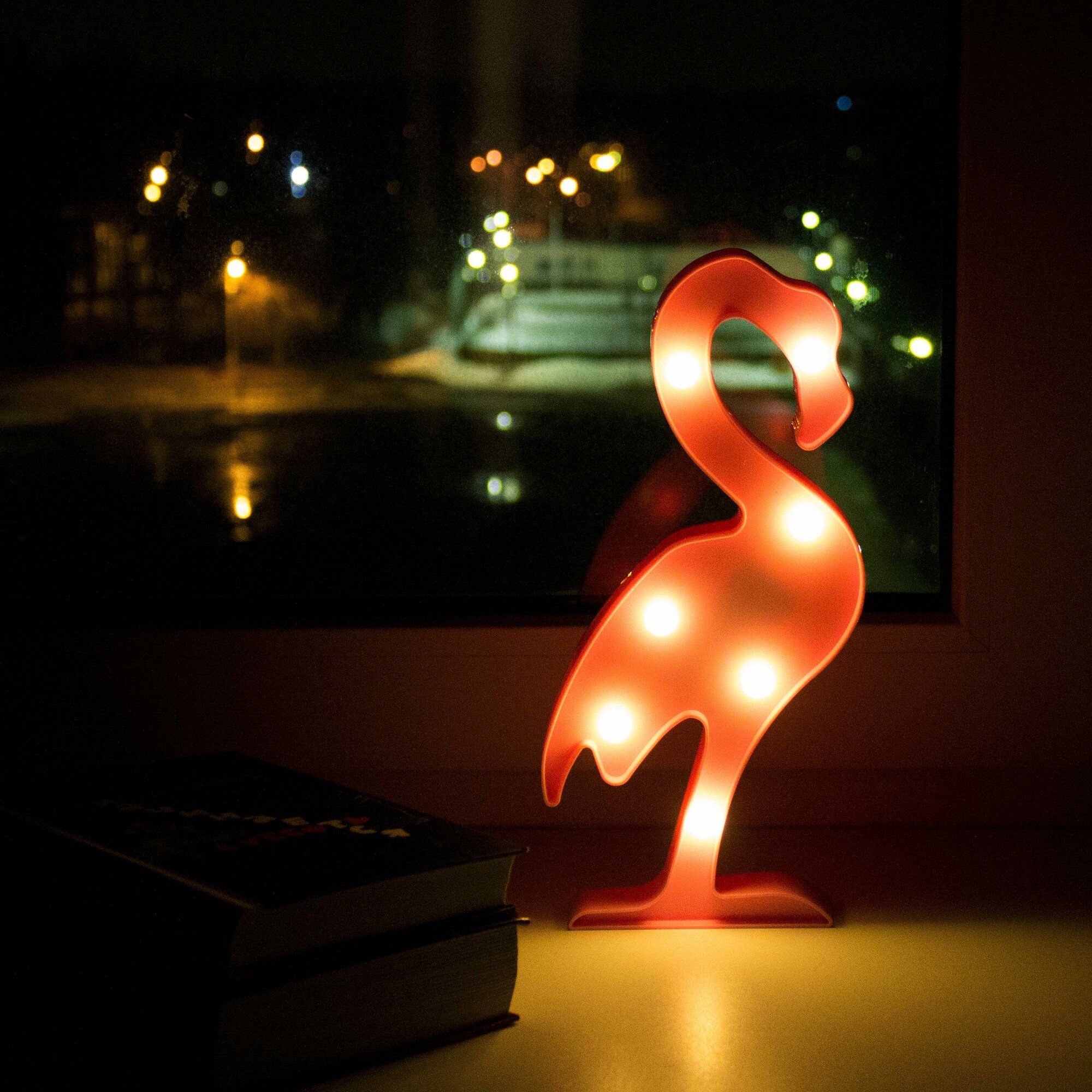 Универсальный светильник выполнен в форме розового фламинго. Обладая насыщенным свечением, используется в качестве детского ночника или декоративного элемента спальни, создавая в помещении приятную и теплую атмосферу. Форма светильника позволяет использовать его в дневное время в качестве детской игрушки.Эстетика и удобство использованияБлагодаря низкому энергопотреблению и работе от двух элементов питания типа АА, ночник работает очень долго. Светильник можно располагать на любой поверхности. Универсальная конструкция электроприбора позволяет устанавливать его на столы и полки, также предусмотрен дополнительный крепеж для монтирования на стену. На стене светильник станет отличным декоративным элементом для стильного оформления интерьера бара или танцевального клуба. Красивый внешний вид светильника дополнит интерьер в детской комнате или станет хорошим другом в качестве игрушки для вашего малыша.