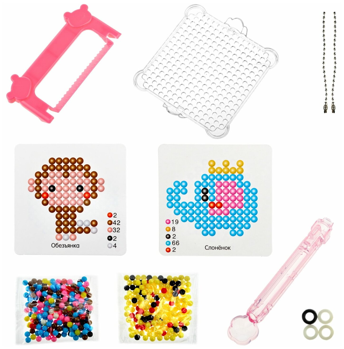 | Состав набора | 347 разноцветных бусин, 4 кольца для брелока, 2 цепочки для брелока, ложечка для бусин, скребок, брызгалка, подложка и 2 трафарета |