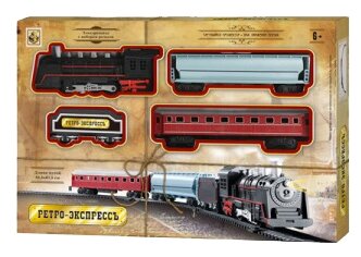 Набор представлен деталями с имитацией железнодорожных рельс, которые легко крепятся между собой, с помощью замочков по краям и электропоездом. Электропоезд исполнен в ретро стиле и состоит из паровоза и 3-х вагонов: грузового и 2х пассажирских. Паровоз и вагоны в наборе выполнены с высокой степенью детализации, масштабная модель позволяет ребенку рассмотреть особенности экспресса XIX века. Тщательное и дельное исполнение придает поезду реалистичный вид и делает игру более правдоподобной. Усиливают это впечатление световые и звуковые эффекты игрушки – поезд на батарейках будет перемещаться по рельсам, освещая себе путь прожектором реалистично воспроизводить звуки движения состава и сигналы.