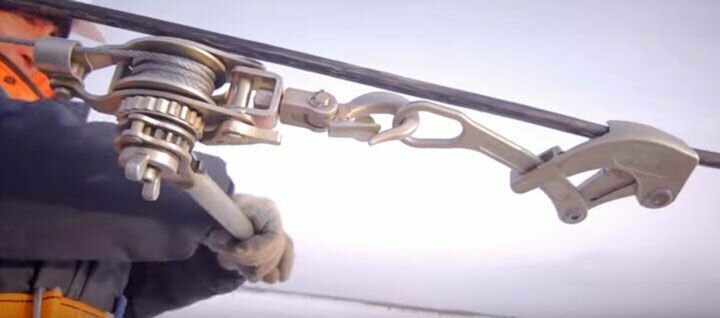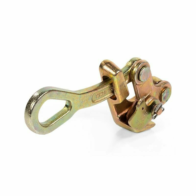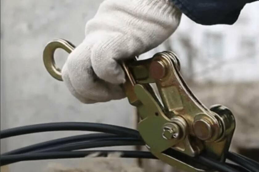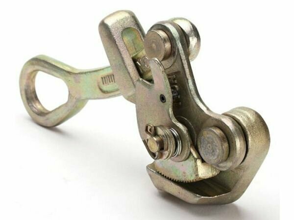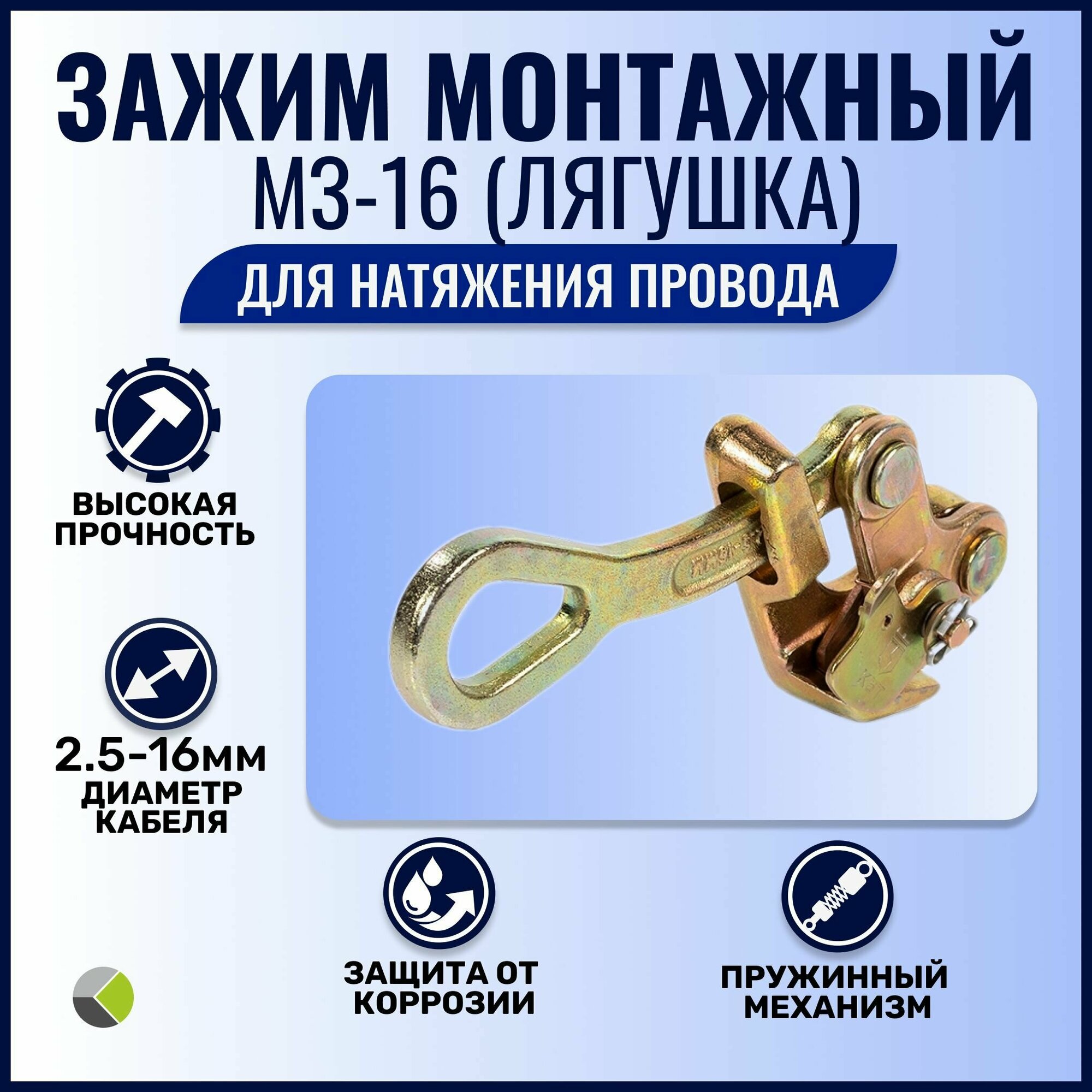 Зажим монтажный (лягушка) ( ) Применяются при регулировке стрелы провеса на линиях СИП путем захвата за несущую жилу Могут использоваться при работах с оптоволоконным кабелем Рычажное устройство преобразует усилие тяги в усилие захвата Тяговые зажимы при работе не повреждают изоляцию провода Назначение: преобразование усилия тяги в усилие захвата СИП Диаметр кабеля (мм): 2.5–16 Рабочая нагрузка (кН): 10 Длина (мм): 185 Вес (кг): 0.7