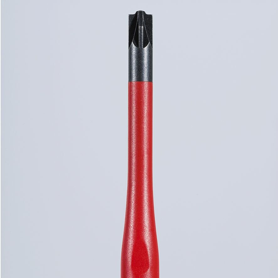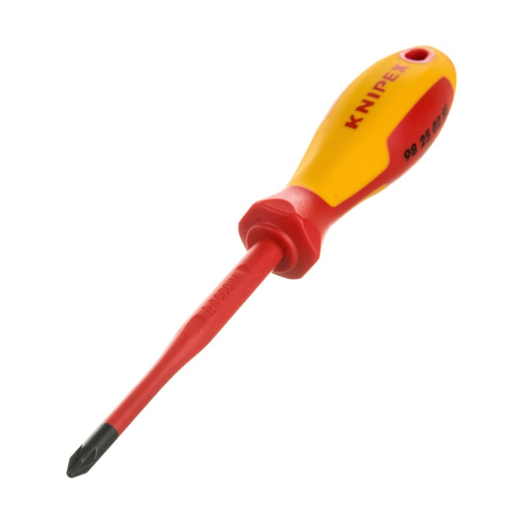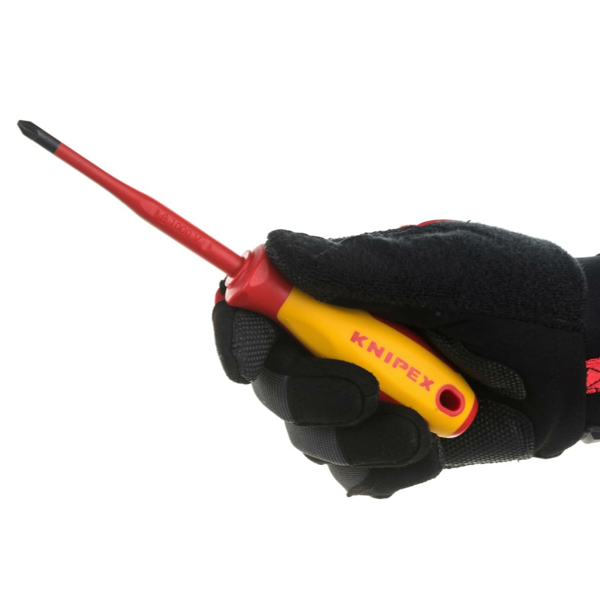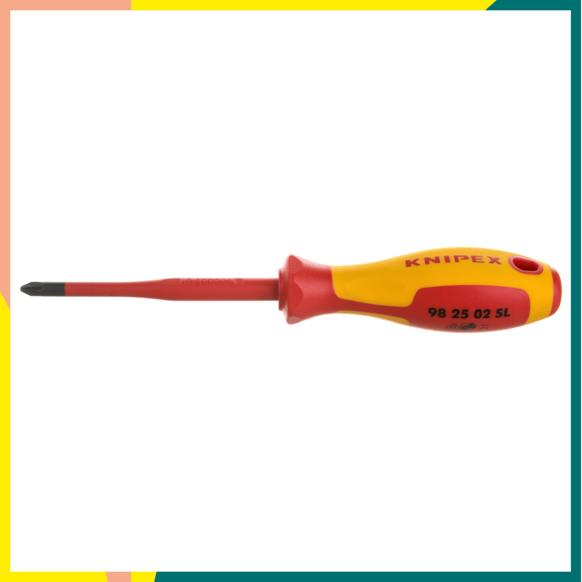 **Отвертка диэлектрическая Knipex** применяется при проведении ремонтных работ. Подходит для монтажа электрического оборудования, подключения счетчика. Имеет плотную изоляцию. Защитит от удара током, в том числе при попадании в обычную фазу. Ручка прямой формы сделана из двухкомпонентного пластика. Полотно изготовлено из стали, устойчивой к коррозии и воздействию влаги.