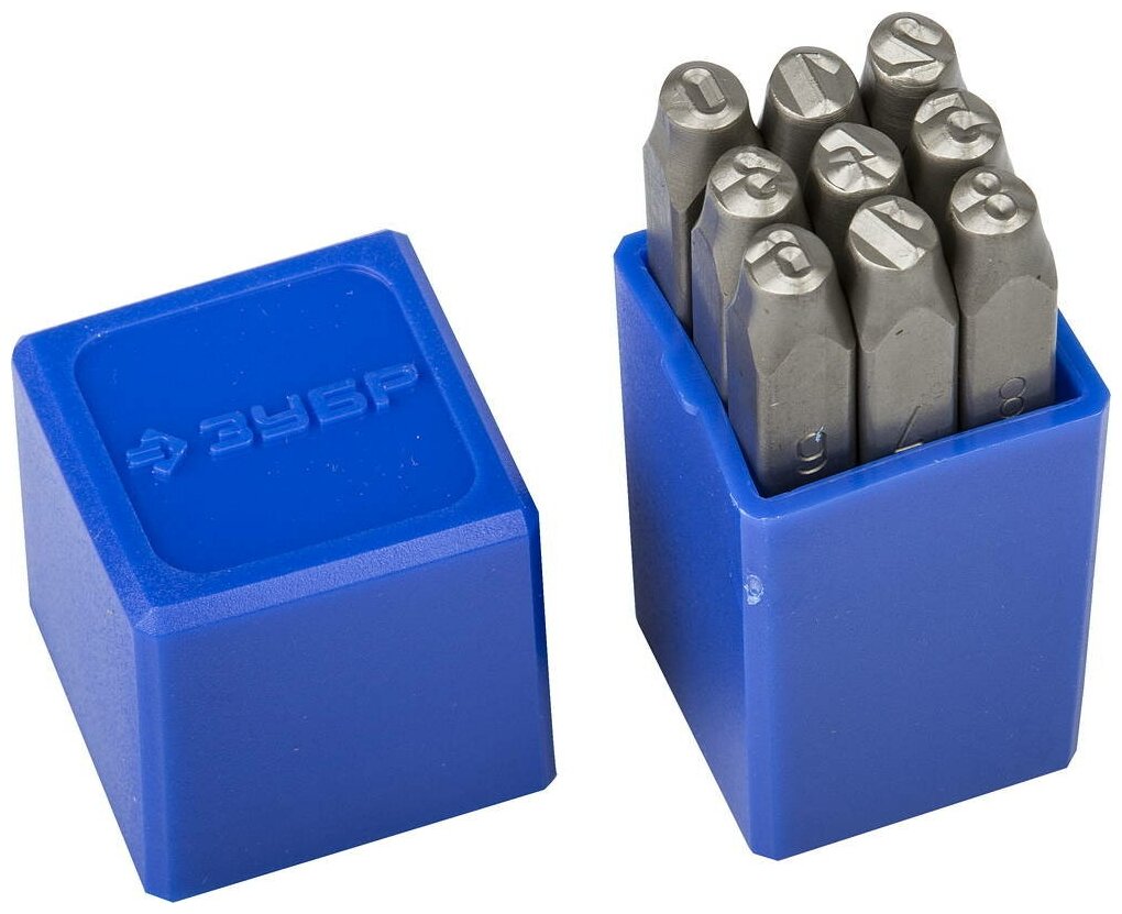 Клеймы "ЭКСПЕРТ" Зубр используются для нанесения штампов в виде цифровых обозначений на различные поверхности в профессиональных и личных мастерских. Изготовлены из высококачественной легированной хромом инструментальной стали со специальным никелированным покрытием. Обладает специальной закалкой до твердости 60–65 HRC.