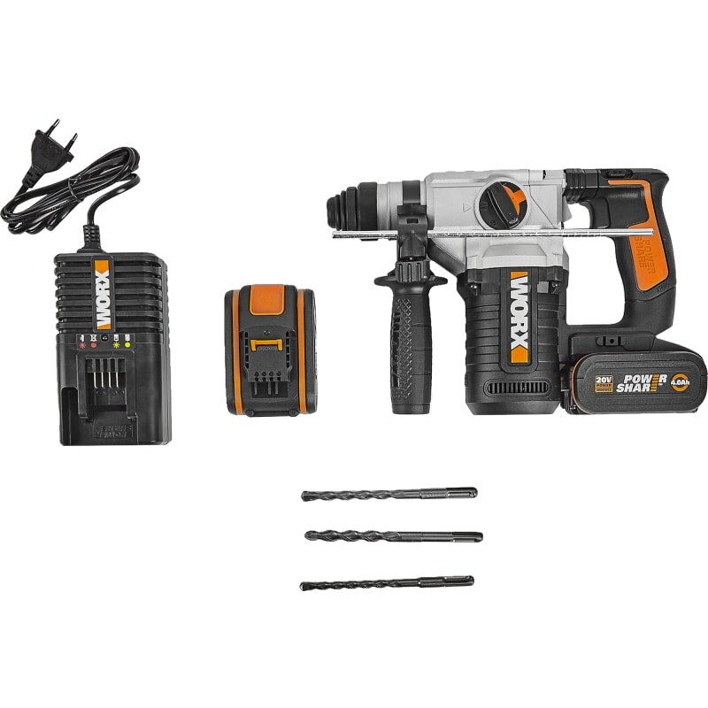 | Аксессуары в комплекте | 2 батареи 4,0 Ач (WA3553); 1 шт зарядное устройство (WA3880); 3шт сверла SDS (8мм, 10мм, 12мм) , Кейс для переноски |