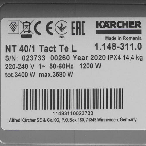 Пылесос Karcher Nt 40/1 tact te l 1.148-311.0