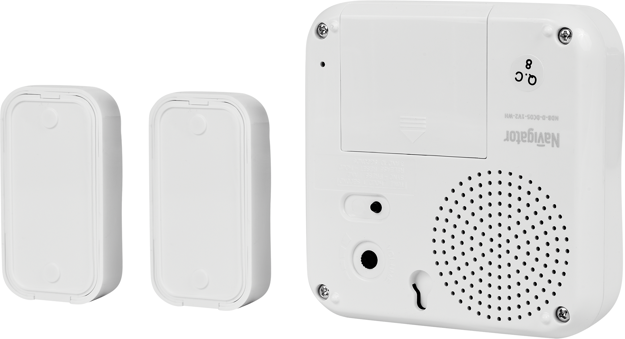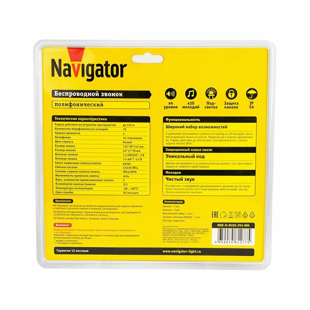 **Дверной звонок Navigator NDB-D-DC05-2V1-WH** - современное беспроводное устройство, предназначенное для подачи светового или звукового сигналов. Благодаря компактной и прочной конструкции может устанавливаться в любом месте снаружи зданий и сооружений разного назначения. Для монтажа и настройки не требуются специальные знания.