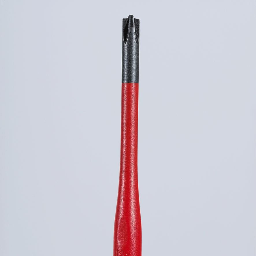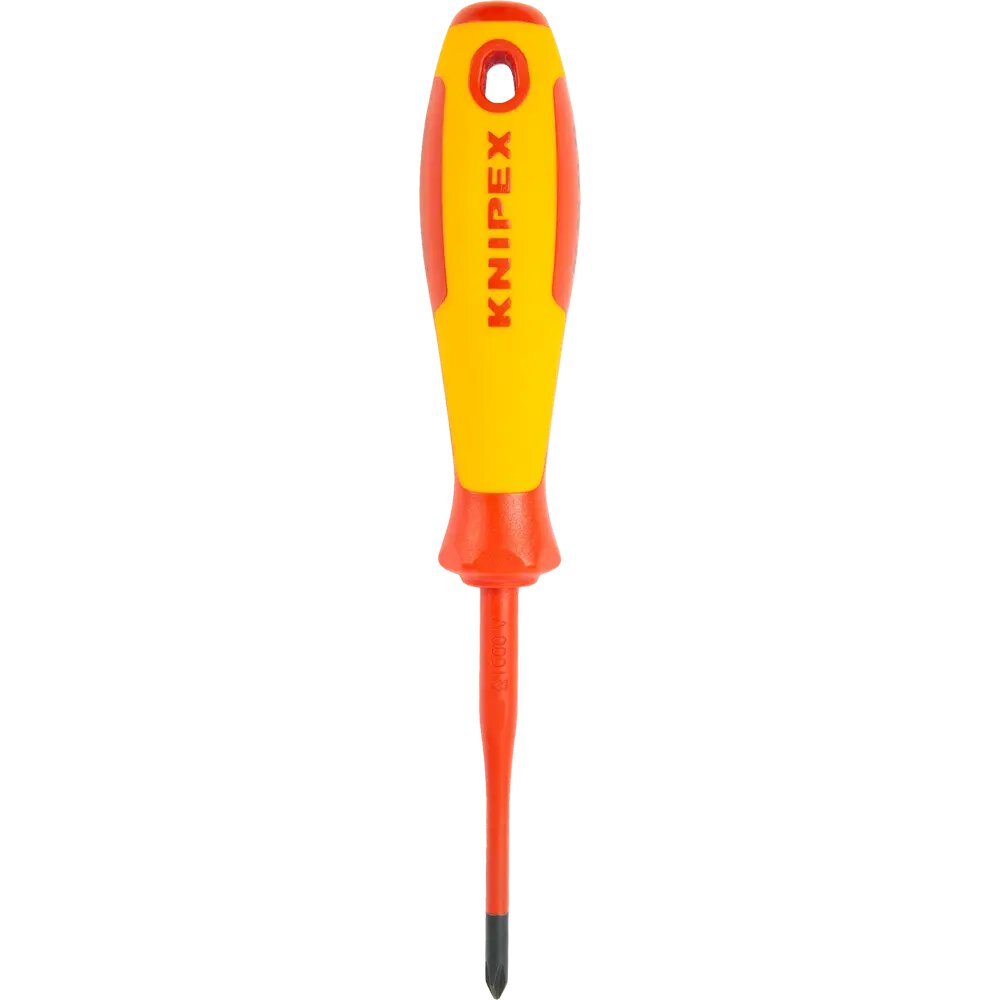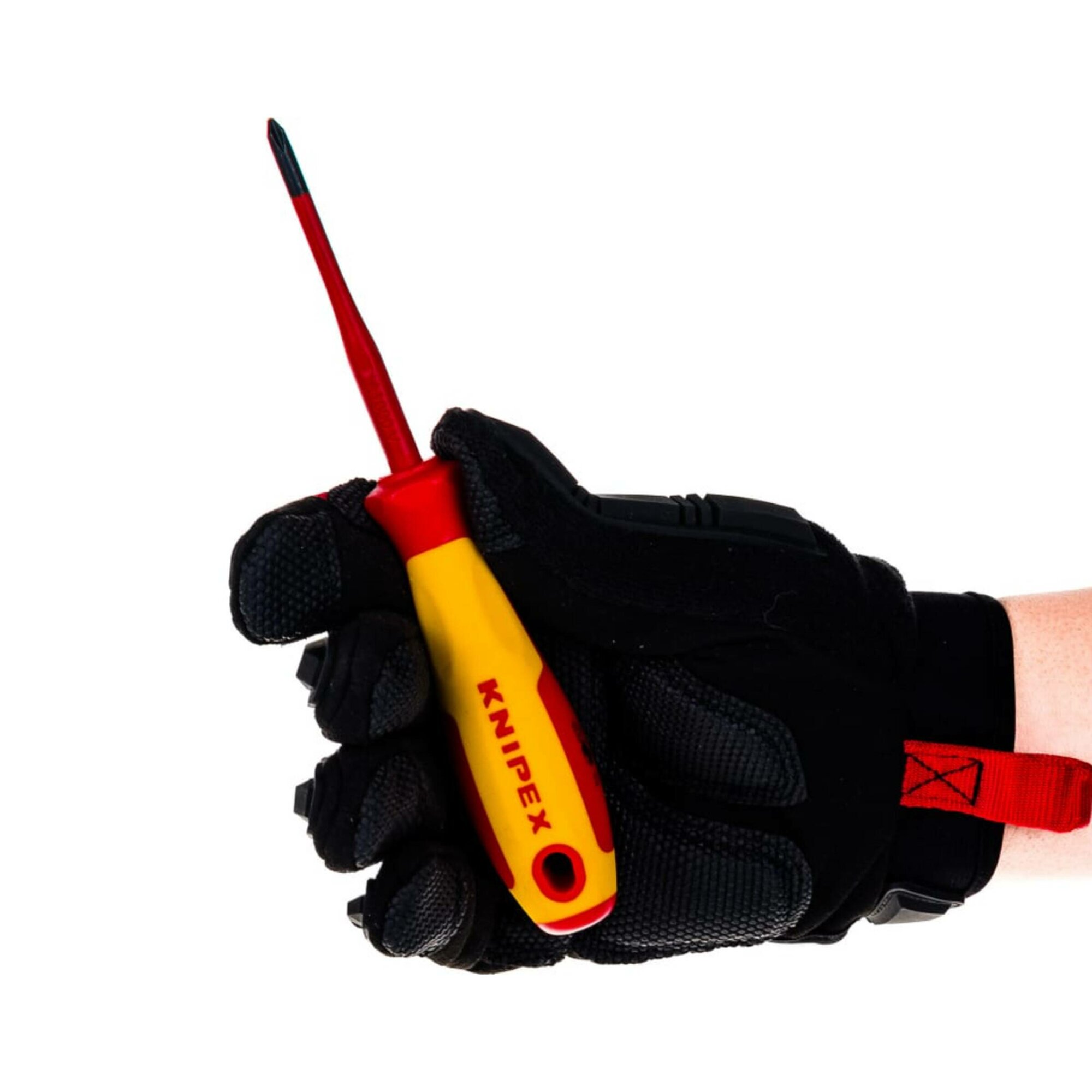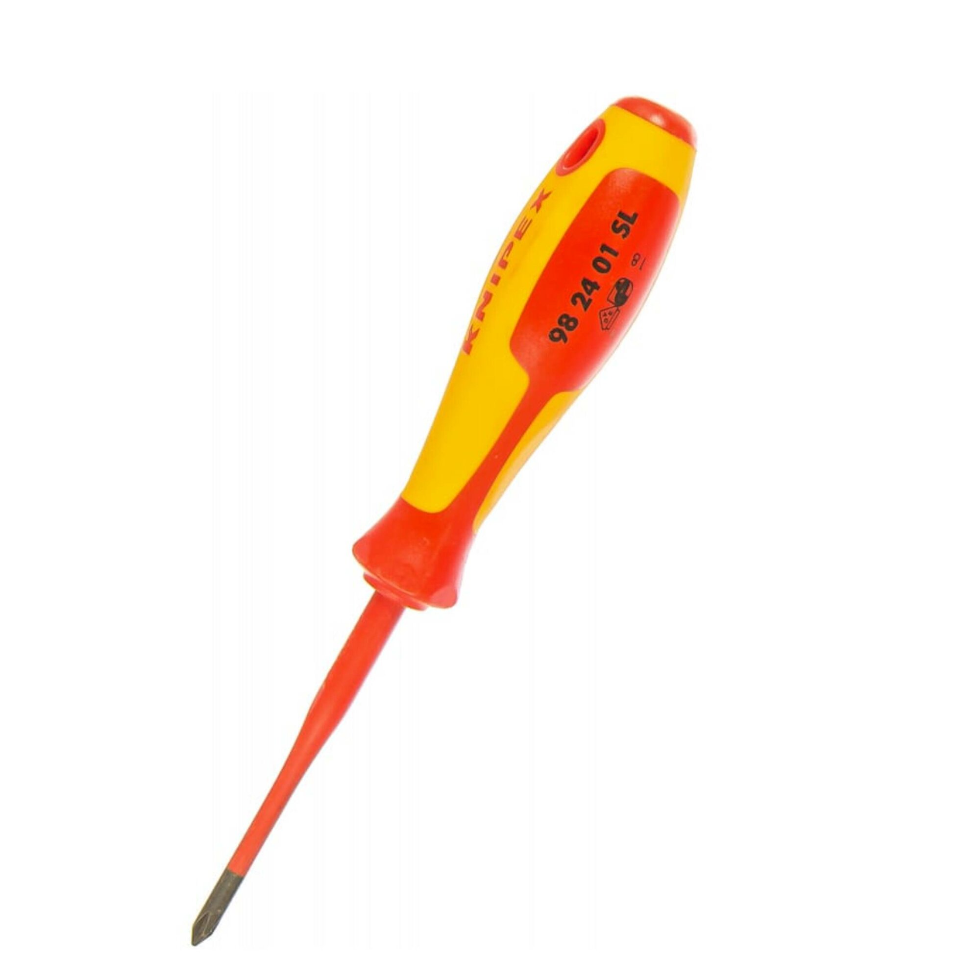 **Отвертка для электрика Knipex** длиной 187 мм предназначена для электромонтажных работ. Подходит для профессионального или бытового использования. Не имеет магнитного наконечника. Эргономичная ручка сделана из двухкомпонентного пластика, удобно лежит в руке и не выскальзывает во время работы.