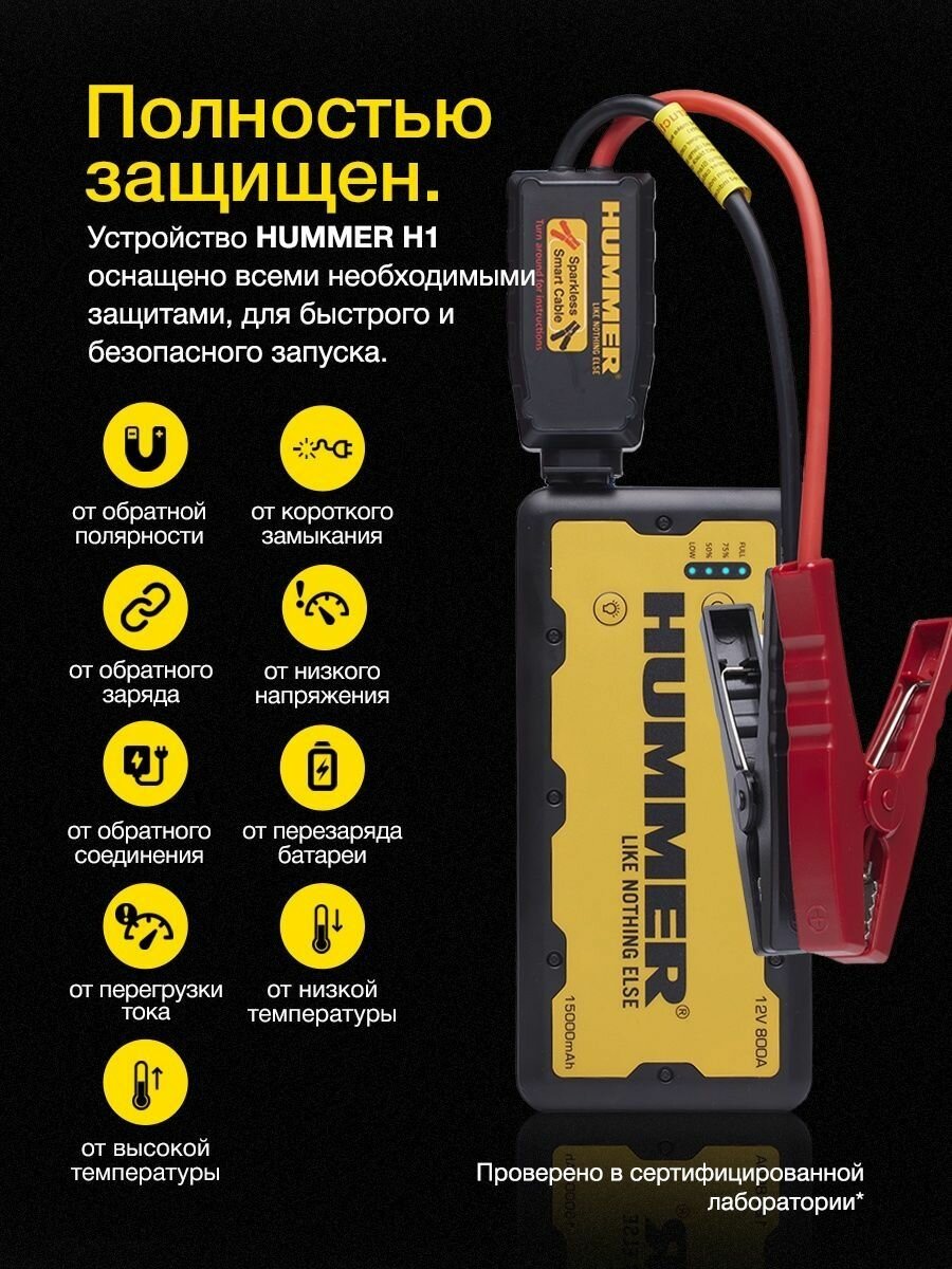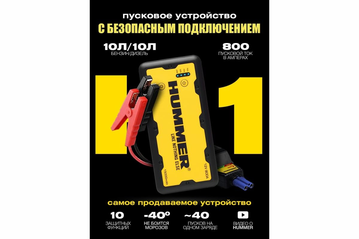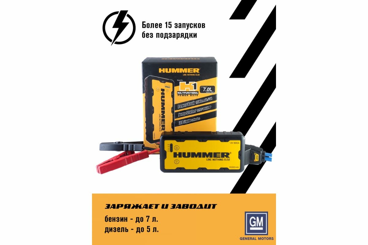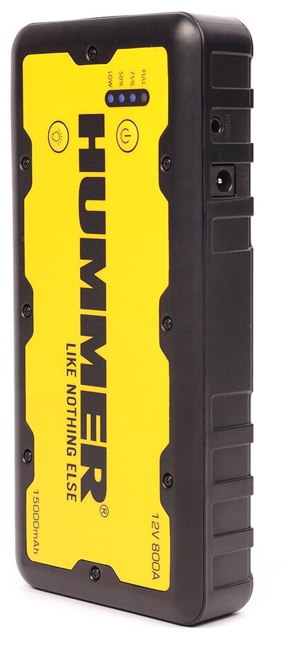 Современное многофункциональное портативное пусковое устройство HUMMER H1 - благодаря пусковому току 800 А, способно запускать как 7-ми литровые бензиновые, так и 5-ти литровые дизельные двигатели. Зажимные клеммы устройства обладают интеллектуальной защитой от обратной полярности, сверхтока, обрыва цепи и перегрева.