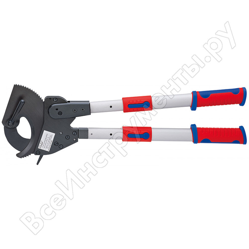 95 32 060 Кабелерез для Cu - и Al кабелей, одно-и многожильных - с жесткой резиновой или пластмассовой оболочкой. Не подходит для стальной проволоки, проволочных канатов и тонкожильных (очень гибких) проводников. также применяется для кабеля с броней, армированной стальной лентой. экономящее усилия резание благодаря оптимальной передаче усилия. высокая режущая способность при работе обеими руками и с использованием принципа трещотки. возможность открытия инструмента из любого положения для резания. длина ручек с многоступенчатой настройкой в диапазоне 400 - 610 мм (укороченные при транспортировке, регулировка с учетом условий работы). Длина инструмента: 600 - 810 мм. вес всего лишь около 3820 г. - Параметры режима резки: медный кабель, многопроводный: 740mm² - Параметры режима резки: медный кабель, многопроводный: Ø 60mm - MCM: 1.400