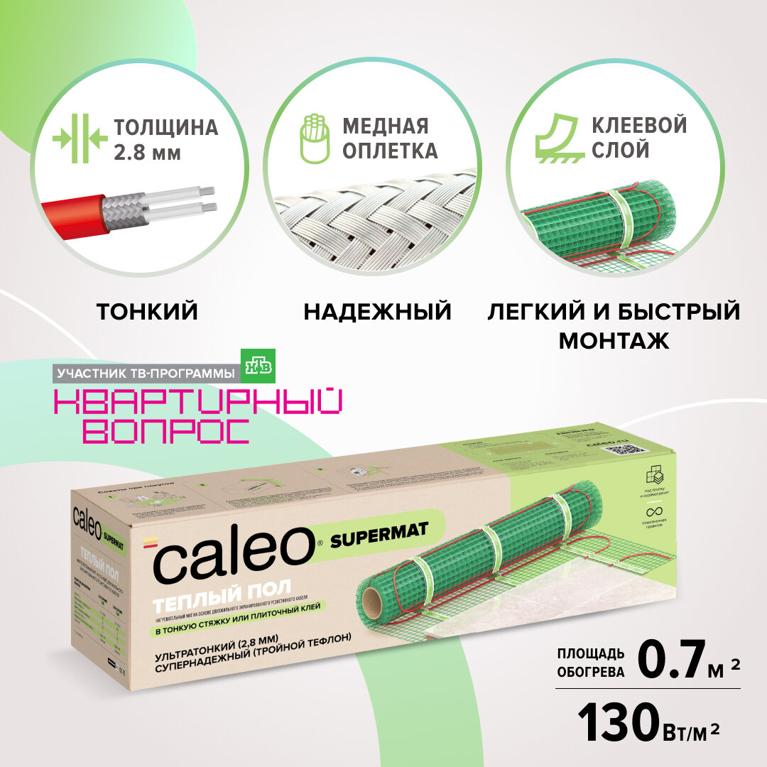 | Прочие особенности и свойства | Предназначен для монтажа в тонкую стяжку, плиточный клей или наливной пол. Обеспечивает подогрев поверхности пола для создания дополнительного комфорта в помещении. Может монтироваться как в стандартных, так и холодных помещениях. Удобная, с постоянным шагом раскладка кабеля на сетке позволяет осуществить легкий и быстрый монтаж термомата на любых поверхностях даже сложных конфигураций.,,Особенности CALEO SUPERMAT,• Сверхтонкий нагревательный мат повышенной надежности.,• 130 Вт/м2 — для стандартных помещений.,• 200 Вт/м2 — для холодных помещений (первые и цокольные этажи, утепленные балконы и лоджии, веранды, загородные дома и т.д.).,• Ультратонкий — 2-2,8 мм толщина нагревательного кабеля.,• Наружная и внутренняя изоляция из высокотемпературного фторполимера.,• Экран в виде оплетки из медной луженой проволоки.,• Сетка с клеевым слоем для удобства фиксации мата к полу при монтаже.,• Гарантия — 50 лет.,,Основные преимущества CALEO SUPERMAT,• Сверхтонкий — один из самых тонких:на 30...50% тоньше аналогов — 2-2,8 мм.,• Надежный — один из самых надежных:один из немногих, имеющих полноценный экран в виде сетчатой оплетки из луженной меди. Единственный, у которого все слои изоляции — высокотемпературные (из фторполимера).,• Удобный — один из самых удобных |