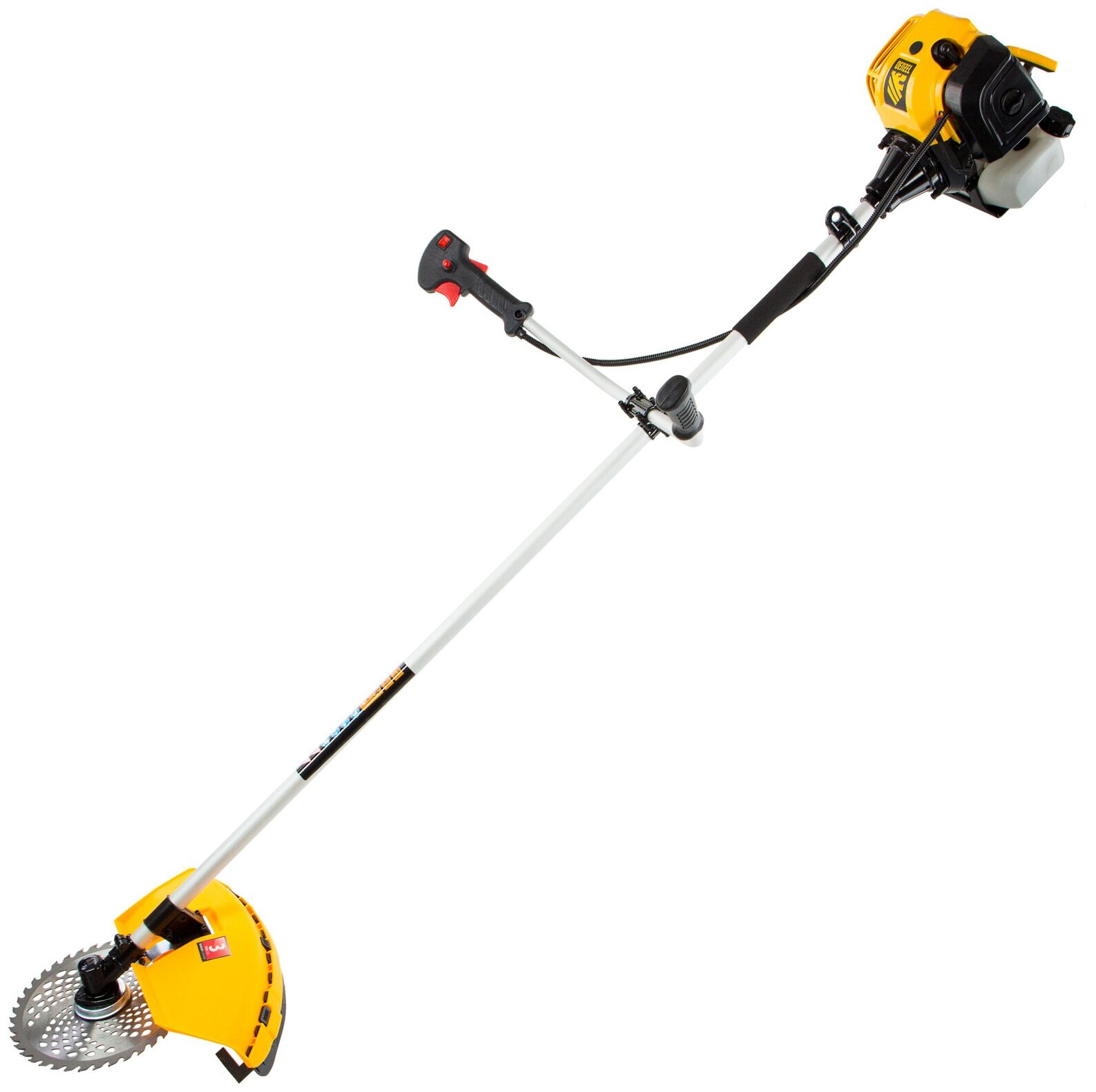 | Дополнительная комплектация | Двигатель в сборе с управляющей правой рукояткой - 1 шт.; левая рукоятка - 1 шт.; шт.анга в сборе - 1 шт.; защитный кожух в сборе с фартуком - 1 шт.; нож кожуха - 1 шт.; катушка полуавтоматическая - 1 шт.; нож трехлопастной - 1 шт.; ремень плечевой - 1 шт.; емкость-дозатор для приготовления топливной смеси - 1 шт.; комплект крепежа - 1 шт.; комплект инструмента - 1 шт.; инструкция с гарантийным талоном |