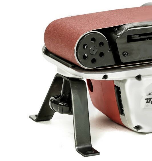 Ленточная шлифмашина, оснащенная мощным двигателем 940 Вт, для быстрого снятия материала. Плоская верхняя часть позволяет повернуть шлифмашину и использовать её как настольный инструмент. Применяются ленты 100 x 610 мм.