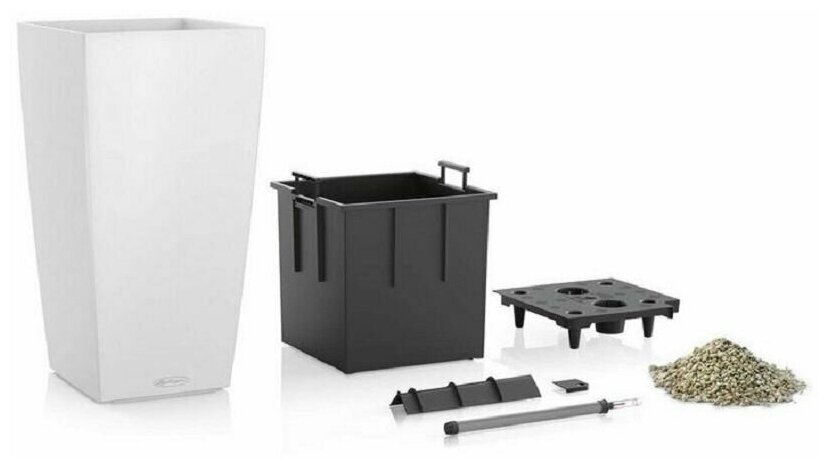 В комплект входит внешний горшок, внутренний горшок и сепаратор (второе дно), индикатор уровня воды, фирменный субстрат LECHUZA-PON и инструкция по сборке.