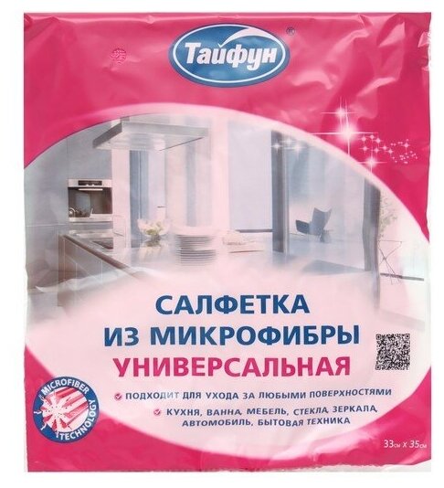 Салфетка для уборки Тайфун Универсальная подходит для ухода за любыми поверхностями на кухне, в ванной и в автомобиле: мебель, стекла, зеркала, бытовая техника. Эффективно удаляет грязь и отлично впитывает влагу. Придает блеск поверхностям.