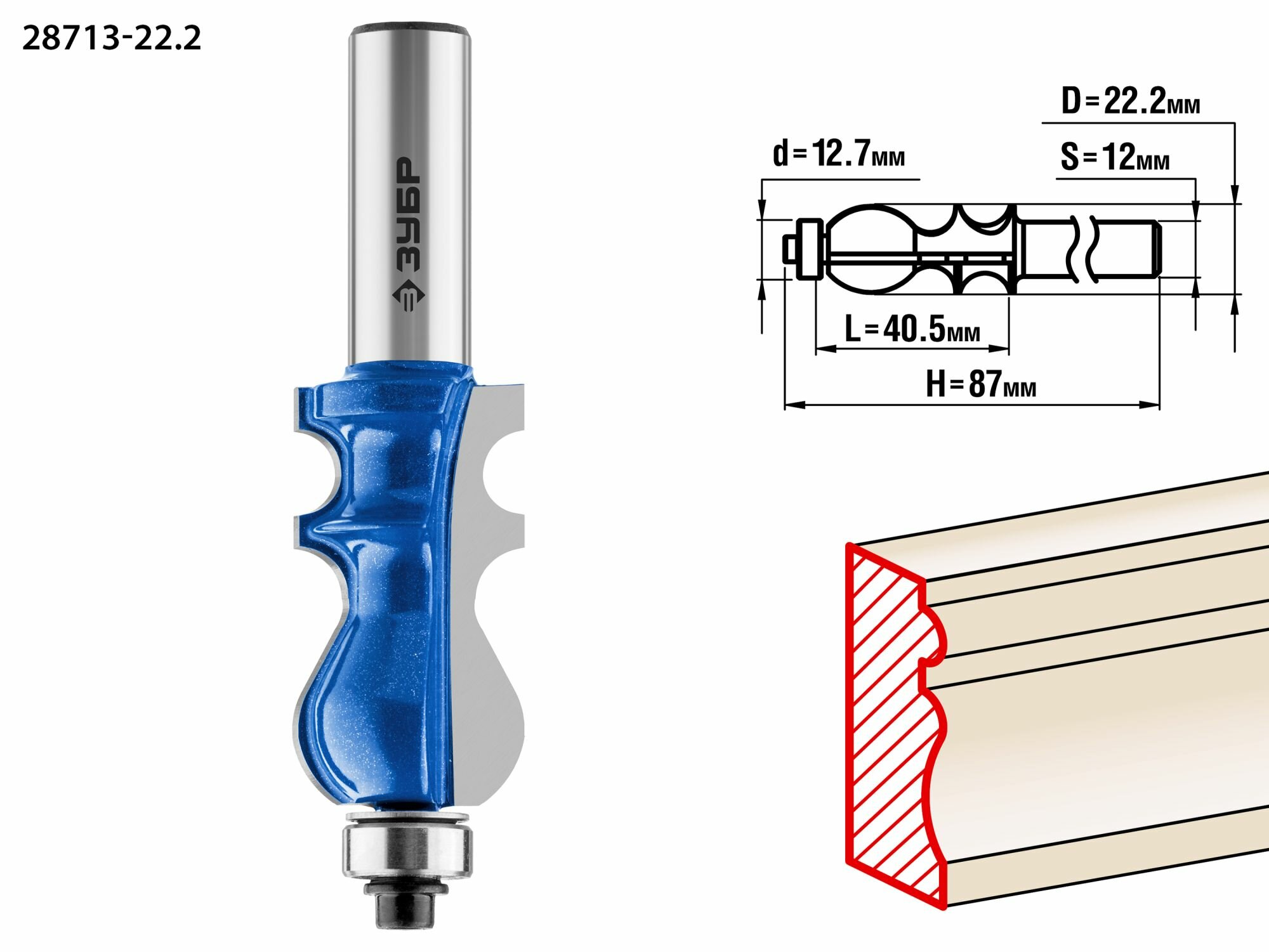 Фреза кромочная фигурная №2, D= 22,2мм, рабочая длина-40,5мм, хв.-12мм, d-12,7мм, ЗУБР Профессионал