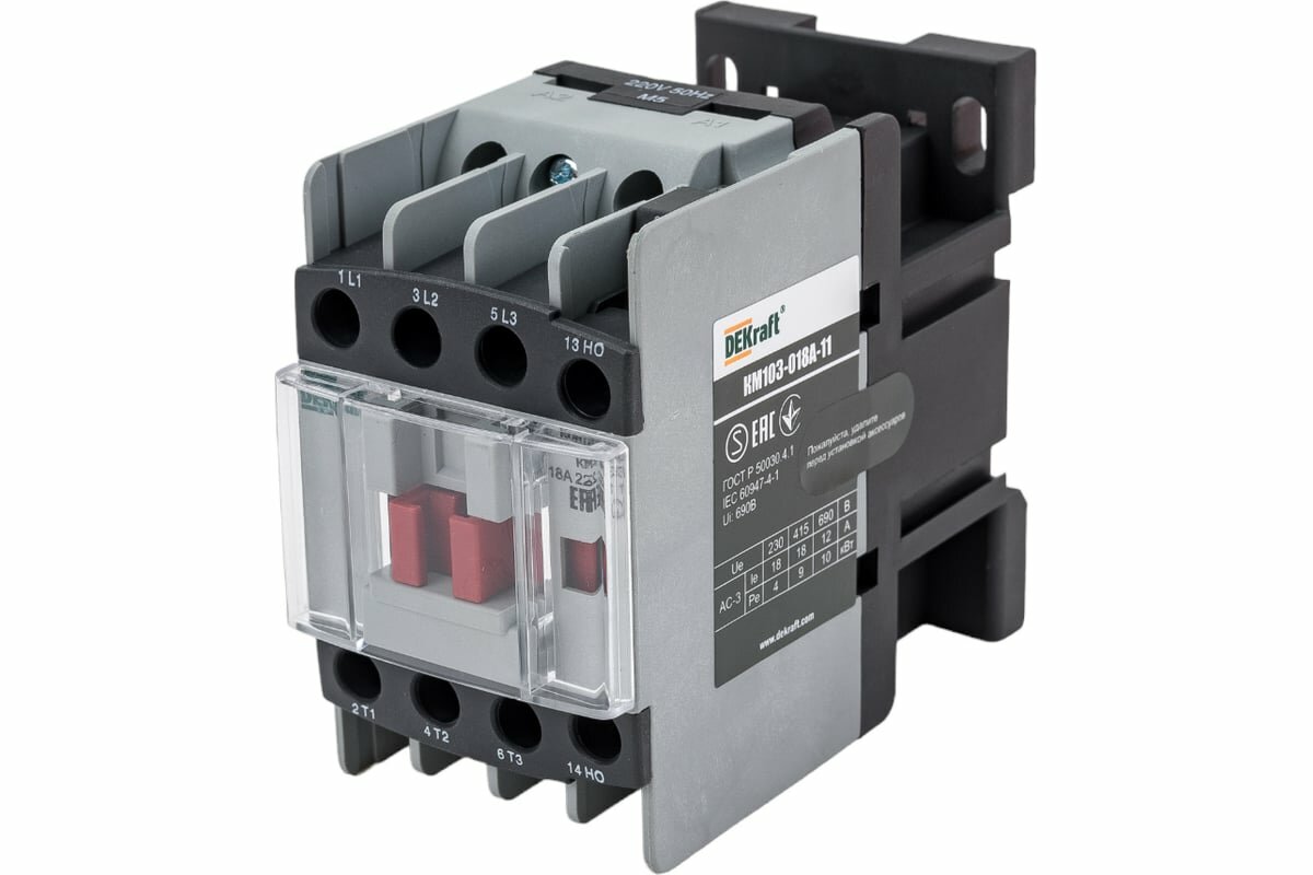 Контактор КМ-103 18А 220В АС3 1НО+1НЗ DEKraft 293781 предназначается для запуска и остановки асинхронных двигателей с короткозамкнутым ротором. Устройство широко применяется в конвейерах, станках, компрессорах, насосах, лифтах, эскалаторах, тепловых пушках и завесах, системах управления отоплением, вентиляцией и кондиционированием. Также аппарат подходит для коммутации осветительных сетей. При использовании контактора в комбинации с электротепловым реле перегрузки он может быть использован в качестве мотор-стартера. Устройство является экономически эффективным - нет необходимости устанавливать контактные приставки, где достаточно двух дополнительных контактов.