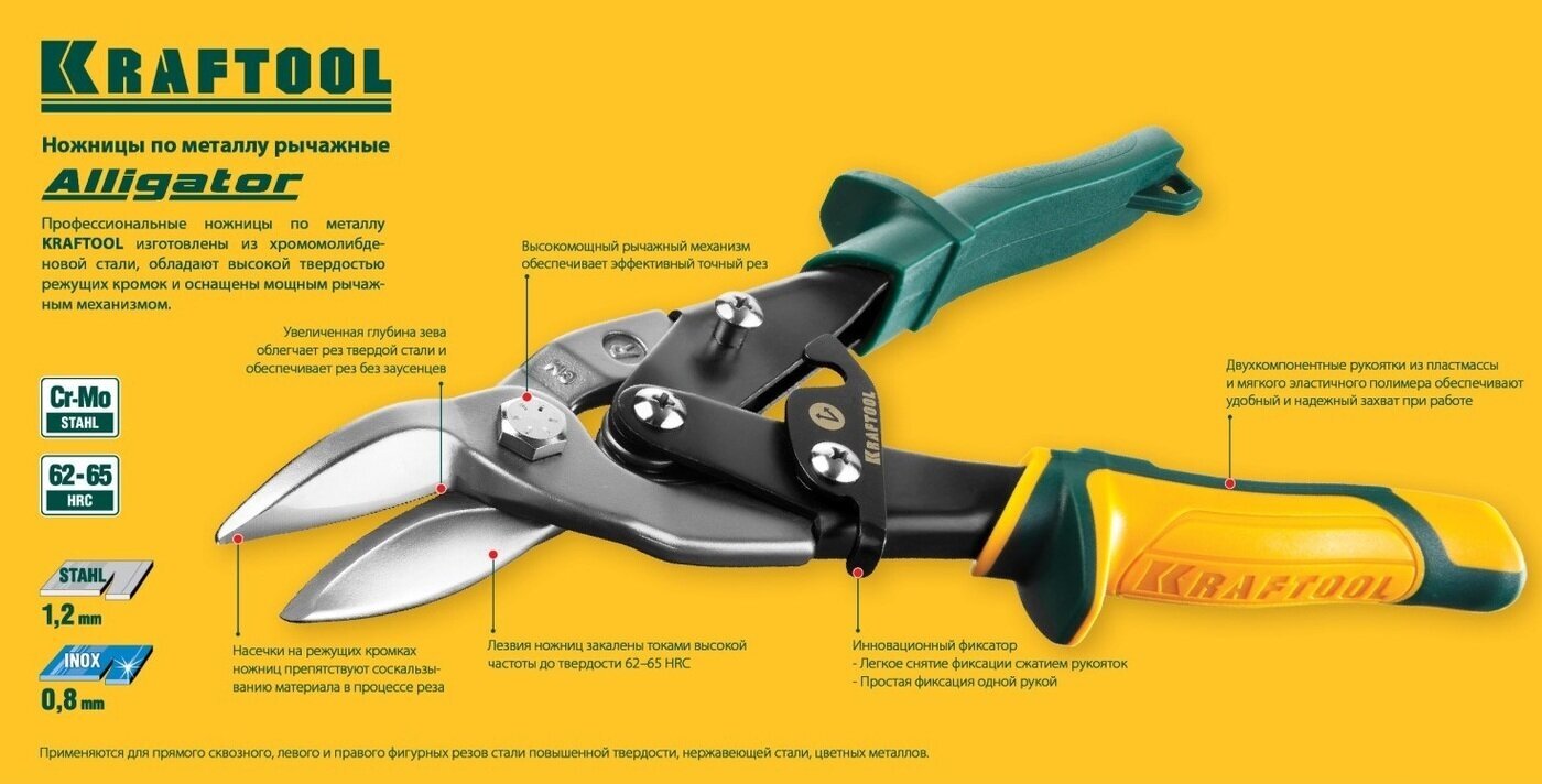 Профессиональные ножницы по металлу KRAFTOOL изготовлены из хромомолибденовой стали, обладают высокой твердостью режущих кромок и оснащены мощным рычажным механизмом. Высокомощный рычажный механизм обеспечивает эффективный точный рез. Увеличенная глубина зева облегчает рез твердой стали и обеспечивает рез без заусенцев. Насечки на режущих кромках ножниц препятствуют соскальзыванию материала в процессе реза. Лезвия ножниц закалены токами высокой частоты до твердости 62–65 HRC. Инновационный фиксатор. Легкое снятие фиксации сжатием рукояток. Простая фиксация одной рукой. Двухкомпонентные рукоятки из пластмассы и мягкого эластичного полимера обеспечивают удобный и надежный захват при работе.